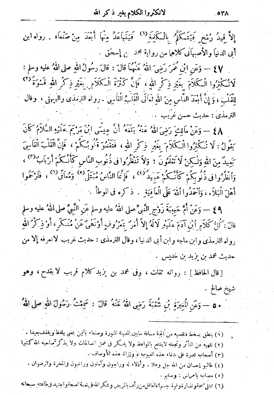 47 - وعن ابن عمر رضي الله عنهما قال: قال رسول الله صلى الله عليه وسلم: "لا تكثروا الكلام بغير ذكر الله، فإن كثرة الكلام بغير ذكر الله قسوةٌ (¬2) للقلب، وإن أبعد الناس من الله تعالى القلب القاسي" رواه الترمذي والبيهقي، وقال الترمذي: حديث حسن غريب.