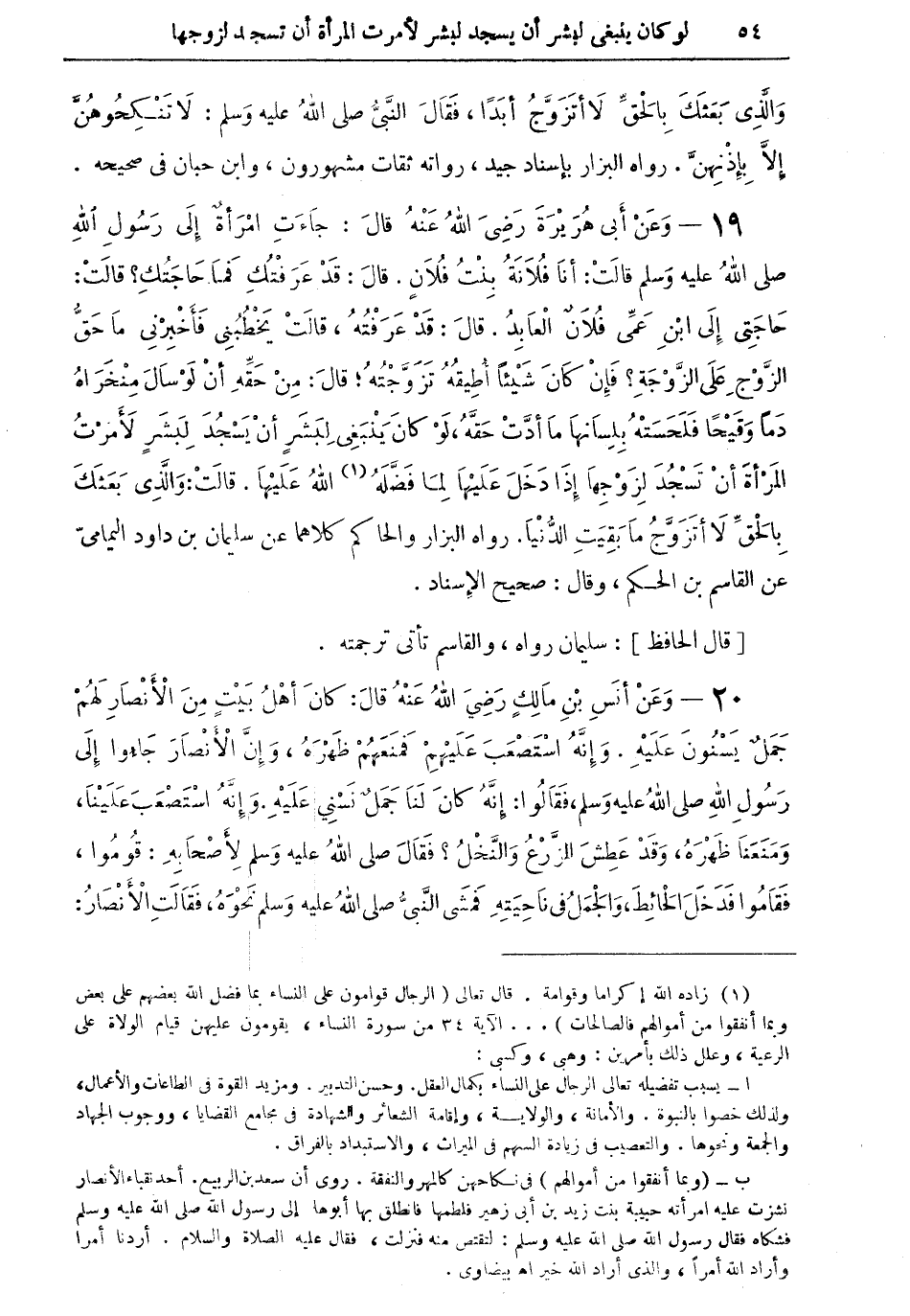 19 - وعن أبي هريرة رضي الله عنه قال: جاءت امرأة إلى رسول الله صلى الله عليه وسلم قالت: "أنا فلانة بنت فلان، قال: قد عرفتك فما حاجتك؟ قالت: حاجتي إلى ابن عمي فلانٌ العابد. قال: قد عرفتهُ، قالت: يخطُبني فأخبرني ما حق الزوج على الزوجة؟ فإن كان شيئاً أطيقه تزوجته؛ قال: من حقهِ أن لو سال منخراه دماً وقيحاً فلحسته بلسانها ما أدت حقه، لو كان ينبغي لبشر أن يسجد لبشرٍ لأمرتُ المرأة أن تسجد لزوجها إذا دخل عليها لما فضله (¬1)