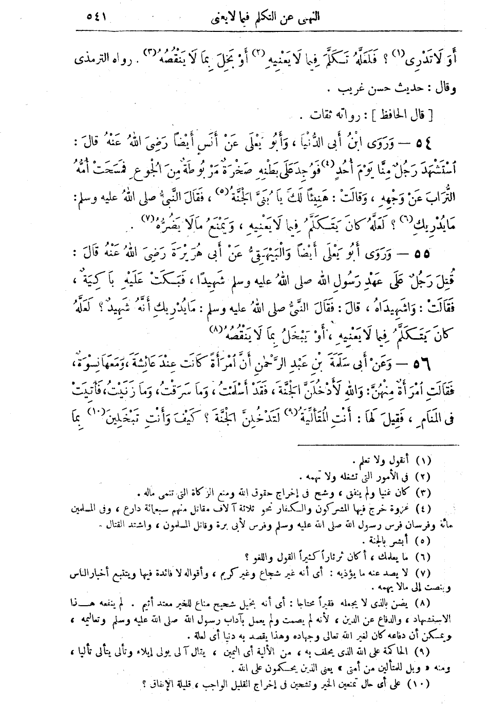 54 - وروى ابن أبي الدنيا، وأبو يعلى عن أنسٍ أيضاً رضي الله عنه قال: "استشهد رجلٌ منا يوم أحد (¬4) فوجد على بطنه صخرةٌ مربوطةٌ من الجوع فمسحتْ أمهُ التراب عن وجهه، وقالت: هنيئاً لك يا بُنَيَّ الجنةُ (¬5)، فقال النبي صلى الله عليه وسلم: ما يُدْريكِ (¬6)؟ لعلهُ كان يتكلمُ فيما لا يعنيه، ويمنعُ ما لا يَضُرُّهُ (¬7) ".