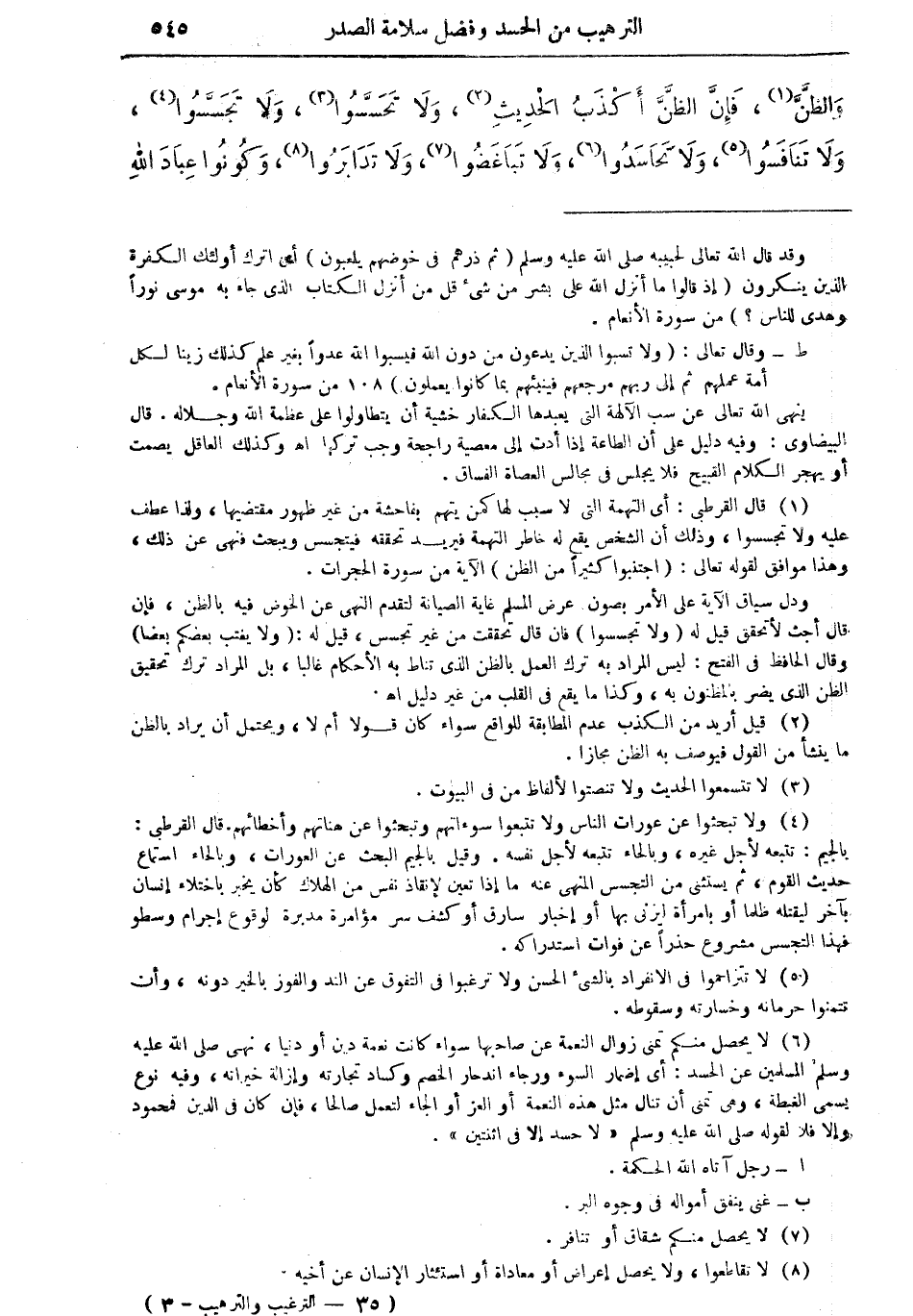 (¬6) لا يحصل منكم تمني زوال النعمة عن صاحبها سواء كانت نعمة دين أو دنيا، نهى صلى الله عليه وسلم المسلمين عن الحسد: أي إضمار السوء ورجاء اندحار الخصم وكساد تجارته وإزالة خيراته، وفيه نوع يسمى الغبطة، وهي تمني أن تنال مثل هذا النعمة أو العز أو الجاه لتعمل صالحاً، فإن كان في الدين فمحمود وإلا فلا لقوله صلى الله عليه وسلم "لا حسد إلا في اثنتين". (أ) رجل آتاه الله الحكمة.