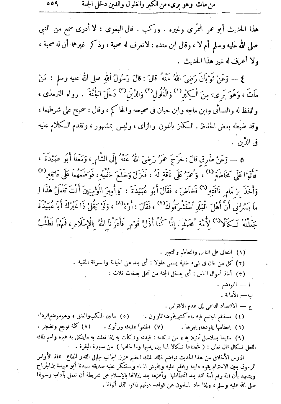 4 - وعن ثوبان رضي الله عنه قال: قال رسول الله صلى الله عليه وسلم: "من مات، وهو بريء من الكبر (¬1) والغلول (¬2) والدَّيْنِ (¬3) دخل الجنة" رواه الترمذي، واللفظ له والنسائي وابن ماجة وابن حبان في صحيحه والحاكم، وقال: صحيح على شرطهما، وقد ضبطه بعض الحفاظ، الكنز بالنون والزاي، وليس بمشهور، وتقدم الكلام عليه في الدَّيْن.