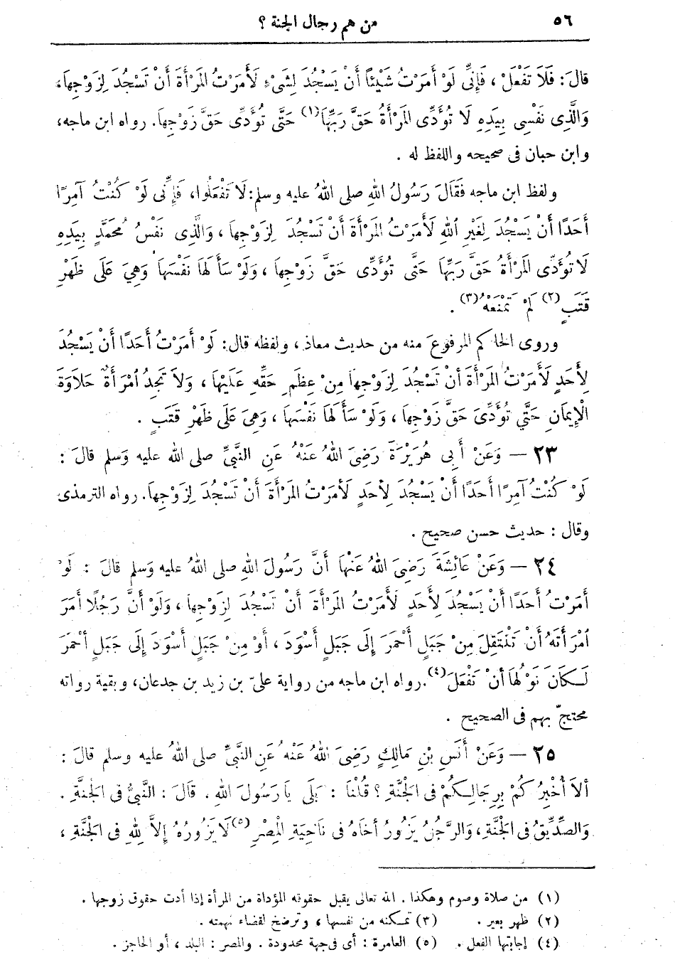 23 - وعن أبي هريرة رضي الله عنه عن النبي صلى الله عليه وسلم قال: "لو كنتُ آمراً أحداً أن يسجدَ لأحدٍ لأمرتُ المرأة أن تسجدَ لزوجها" رواه الترمذي، وقال: حديث حسن صحيح.