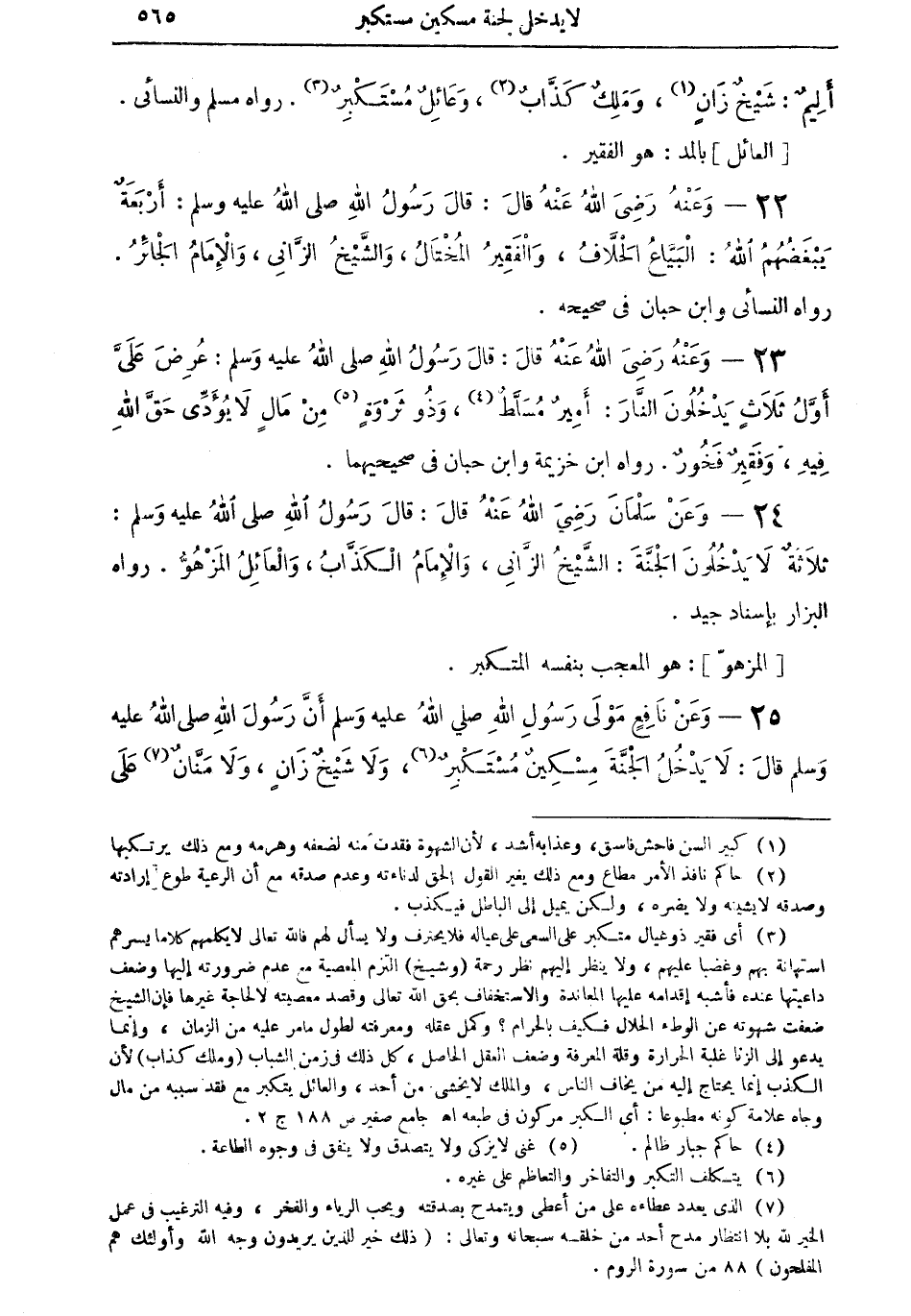 25 - وعن نافعٍ مولى رسول الله صلى الله عليه وسلم أن رسول الله صلى الله عليه وسلم قال: "لا يدخلُ الجنة مسكينٌ مُستكبرٌ (¬6)، ولا شيخٌ زانٍ، ولا مَنَّانٌ (¬7) على