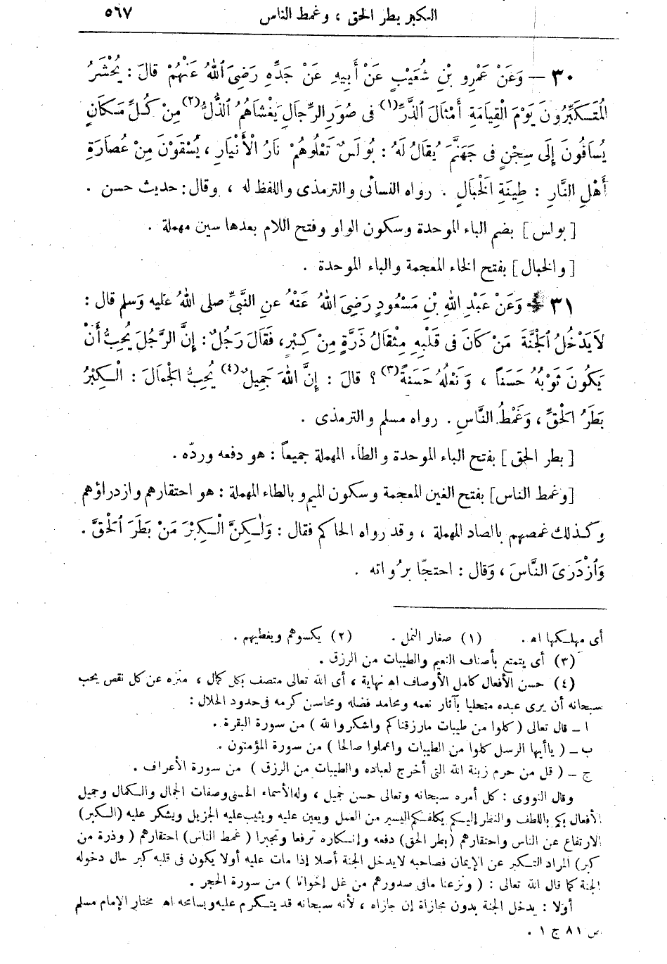 31 - وعن عبد الله بن مسعودٍ رضي الله عنه عن النبي صلى الله عليه وسلم قال: "لا يدخلُ الجنة من كان في قلبه مثقالُ ذرةٍ من كبرٍ، فقال رجلٌ: إن الرجل يحبُّ أن يكون ثوبهُ حسناً، ونعلهُ حسنةً (¬3)؟