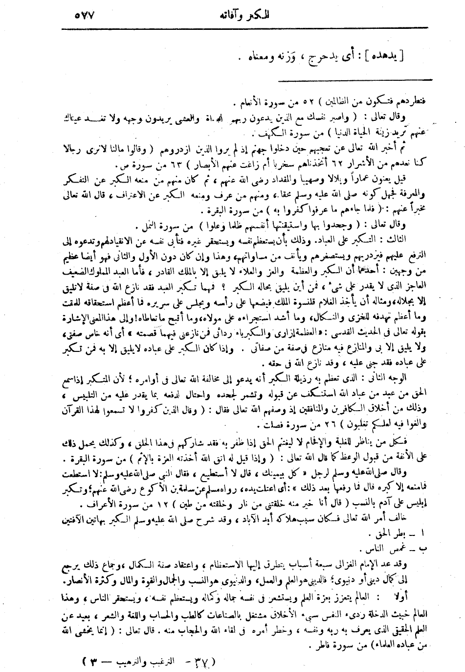 فكل من يناظر للغلبة والإفحام لا ليغنم الحق إذا ظفر به فقد شاركهم في هذا الخلق، وكذلك يحمل ذلك على الأنفة من قبول الوعظ كما قال الله تعالى: "وإذا قيل له اتق الله أخذته العزة بالإثم" (من سورة البقرة). وقال صلى الله عليه وسلم لرجل: "كل بيمينك، قال لا أستطيع، فقال النبي صلى الله عليه وسلم: لا استطعت فما منعه إلا كبره قال فما رفعها بعد ذلك" أي اعتلت يده، رواه مسلم عن سلمة بن الأكوع رضي الله عنهم، وتكبر إبليس على آدم بالنسب: "قال أنا خير منه خلقتني من نار وخلقته من طين" (12 من سور ة الأعراف). خالف أمر الله تعالى فكان سبب هلاكه أبد الآباد، وقد شرح صلى الله عليه وسلم الكبر بهاتين الآفتين: