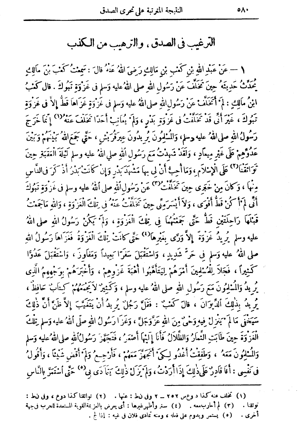 1 - عن عبد الله بن كعب بن مالكٍ رضي الله عنه قال: "سمعت كعب بن مالكٍ يُحَدِّثُ حديثهُ حين تخلفَ عن رسول الله صلى الله عليه وسلم في غزوة تبوك. قال كعبُ بن مالكٍ: لم أتخلف عن رسول الله صلى الله عليه وسلم في غزوةٍ غزاها قطُّ إلا في غزوة تبوك، غير أني قد تخلفتُ في غزوة بدرٍ، ولم يُعَاتِبْ أحداً تخلف عنه (¬1) إنما خرج رسول الله صلى الله عليه وسلم، والمسلمون يريدون عير قريشٍ حتى جمع الله بينهم، وبين عدوهم على غير ميعادٍ، ولقد شهدتُ مع رسول الله صلى الله عليه وسلم ليلة العقبةِ حين تواثقنا (¬2) على الإسلام، وما أحِبُّ أن لي بها مشهدَ بدرٍ، وإن كانت بدراً ذُكِرَ في الناس منها، وكان من خبري حين تخلفتُ (¬3) عن رسول الله صلى الله عليه وسلم في غزوة تبوك أني لم أكن قَطُّ أقوى، ولا أيسرَ مني حين تخلفتُ عنه في تلك الغزوةِ، والله ما جمعتُ قبلها راحلتين قَطُّ حتى جمعتهما في تلك الغزوة، ولم يكن رسول الله صلى الله عليه وسلم يريدُ غزوةً إلا وَرَّى بغيرها (¬4)