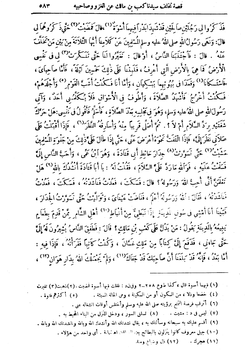 فذكروا لي رجلين صالحين قد شهدا بدراً فيهما أسوةٌ (¬1)، قال فمضيتُ (¬2) حتى ذكروهما لي قال: ونهى رسول الله صلى الله عليه وسلم المسلمين عن كلامنا أيها الثلاثة من بين مَنْ تخلف عنه. قال: فَاجْتَنَبَنَا الناسُ، أو قال: تَغَيَّرُوا لنا حتى تَنَكَّرَتْ (¬3) لي في نفسي الأرض، فما هي بالأرض التي أعرفُ فلبثنا على ذلك خمسين ليلةً، فأما صاحبايَ، فاستكانا (¬4)