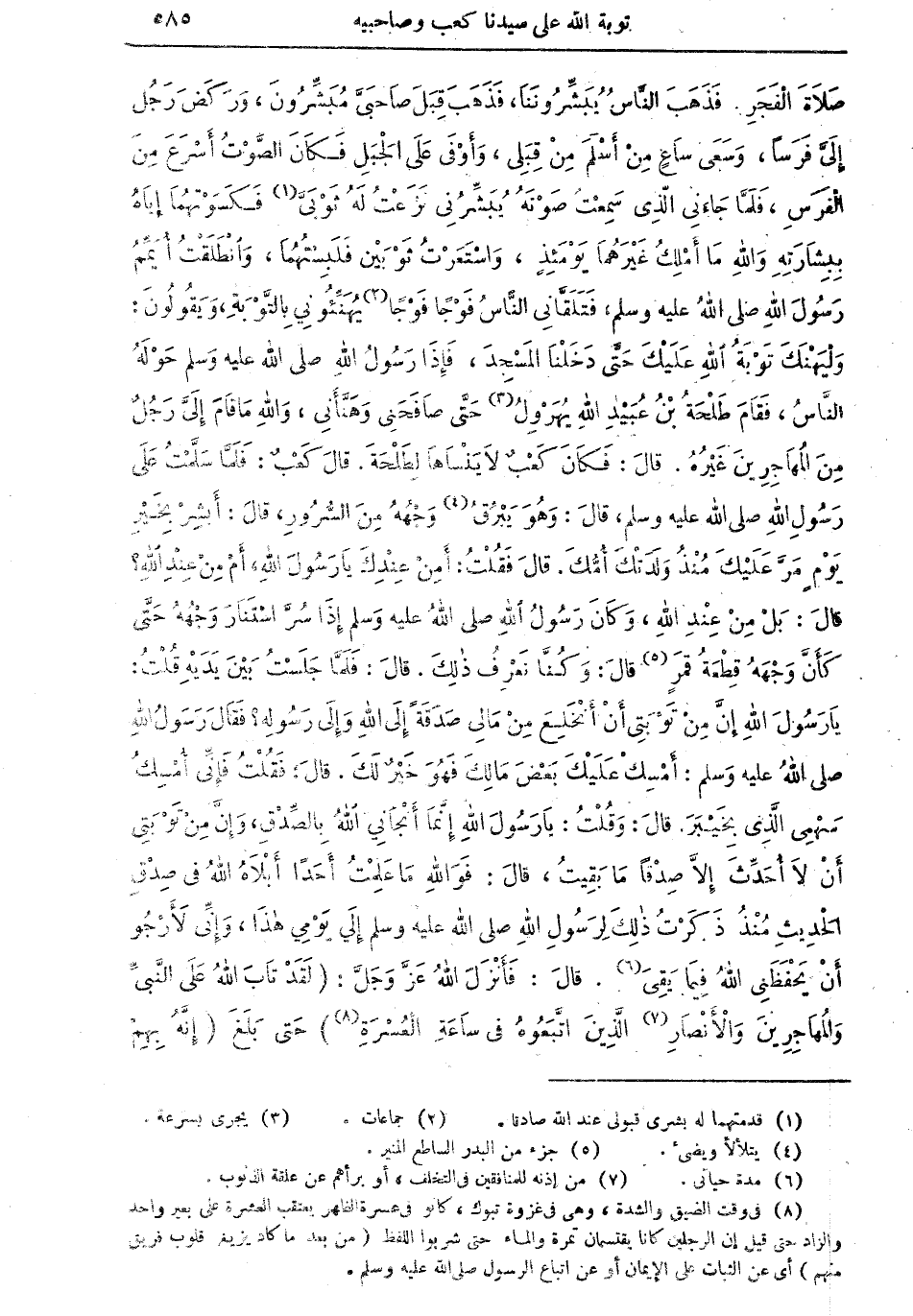 صلاة الفجرِ، فذهب الناس يُبَشروننا، فذهب قِبَلَ صاحبيَّ مُبشرون، وركضَ رجلٌ إليَّ فَرَساً، وسعى ساعٍ من أسْلَمَ من قِبَلِي، وأوْفَى على الجبل فكان الصوتُ أسرع من الفرس فلما جاءني الذي سمعتُ صوتهُ يبشرني نزعتُ له ثوبيَّ (¬1) فكسوتهما إياهُ ببشارته والله ما أمْلِكُ غيرهما يومئذٍ، واستعرتُ ثوبين فلبستهما، وانطلقتُ أُيَمِّمُ رسول الله صلى الله عليه وسلم، فتلقاني الناس فوجاً فوجاً (¬2) يُهنئوني بالتوبة، ويقولون: وَلْيَهْنَكَ توبةُ الله عليك حتى دخلنا المسجد، فإذا رسول الله صلى الله عليه وسلم حوله الناس، فقام طلحةُ ابن عبيد الله يهرول (¬3) حتى صافحني وهنأني، والله ما قام إليَّ رجلٌ من المهاجرين غيرهُ. قال: فكان كعبٌ لا ينساها لطلحةَ. قال كعبٌ: فلما سَلَّمْتُ على رسول الله صلى الله عليه وسلم، قال: وهو يَبْرُقُ (¬4) وجهه من السرور، قال: أبشر بخير يوم مَرَّ عليك منذ ولدتك أمك. قال فقلتُ: أمِنْ عندك يا رسول الله، أم من عند الله؟ قال: بل من عند الله، وكان رسول الله صلى الله عليه وسلم إذا سُرَّ استنار وجهه حتى كأن وجهه قطعةُ قمرٍ (¬5)