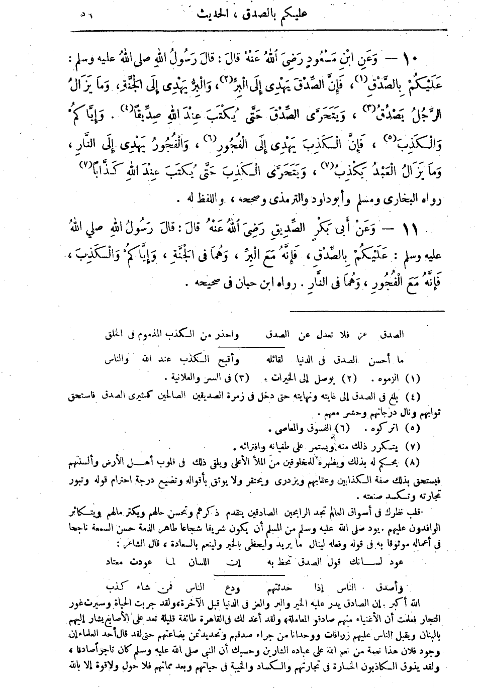 الله أكبر. إن الصادق يدر عليه الخير والبر والعز في الدنيا قبل الآخرة، ولقد جربت الحياة وسبرت غور التجار فعلمت أن الأغنياء منهم صادقو المعاملة، ولقد أعد لك في القاهرة طائفة قليلة تعد على الأصابع يشار إليهم بالبنان، ويقبل الناس عليهم زرافات ووحدانا من جراء صدقهم وتحديد ثمن بضاعتهم حتى لقد قال أحد العلماء إن وجود فلان هذا نعمة من نعم الله على عباده الشارين وحسبك أن النبي صلى الله عليه وسلم كان تاجراً صادقاً ولقد يذوق الكاذبون الخسارة في تجارتهم والكساد والخيبة في حياتهم وبعد مماتهم فلا حول ولا قوة إلا بالله.