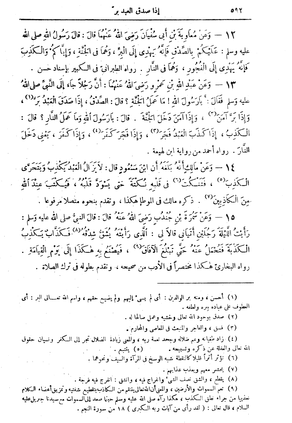 12 - وعن معاوية بن أبي سفيان رضي الله عنهما قال: قال رسول الله صلى الله عليه وسلم: "عليكم بالصدقِ فإنه يهدي إلى البر، وهما في الجنة، وإياكم والكذب فإنه يهدي إلى الفجور، وهما في النار" رواه الطبراني في الكبير بإسناد حسن.