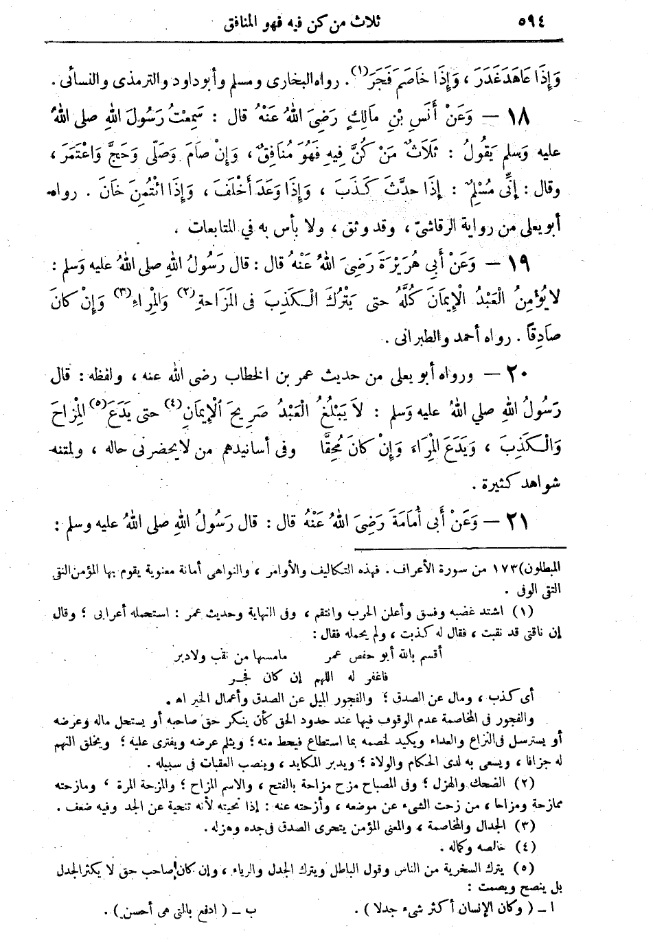 18 - وعن أنس بن مالكٍ رضي الله عنه قال: سمعت رسول الله صلى الله عليه وسلم يقول: "ثلاثٌ من كُنَّ فيه فهو مُنافقٌ، وإن صام وصلى وحجَّ واعتمرَ، وقال: إني مُسلمٌ: إذا حَدَّثَ كذبَ، وإذا وعد أخلفَ، وإذا ائتُمِنَ خان" رواه أبو يعلى من رواية الرقاشي، وقد وثق، ولا بأس به في المتابعات.