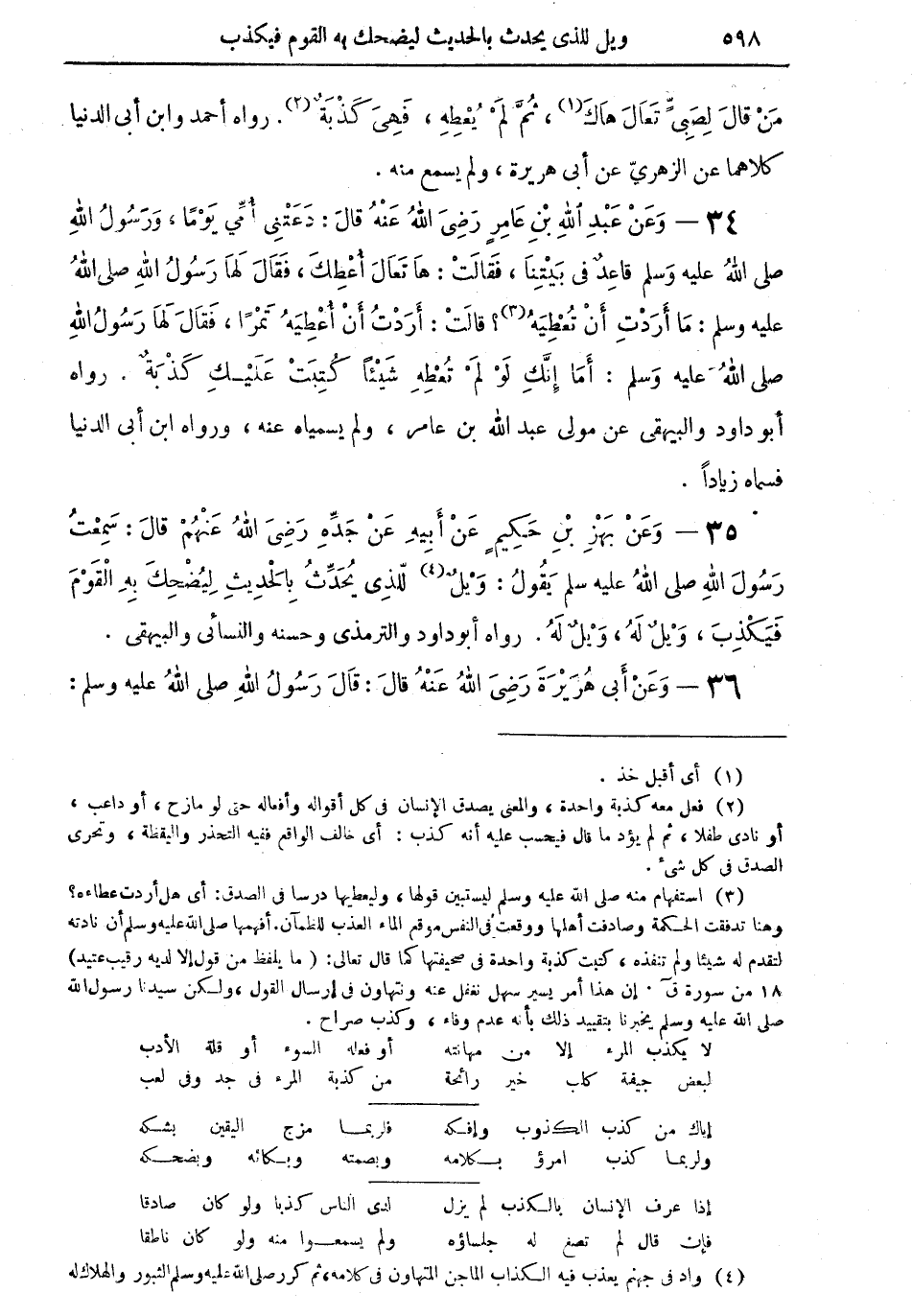 35 - وعن بَهْزِ بن حكيمٍ عن أبيه عن جده رضي الله عنهم قال: سمعت رسول الله صلى الله عليه وسلم يقول: "ويلٌ (¬4) للذي يُحَدِّثُ بالحديث لِيُضْحِكَ به القوم فيكذب، ويلٌ له، ويلٌ له" رواه أبو داود والترمذي وحسنه والنسائي والبيهقي.