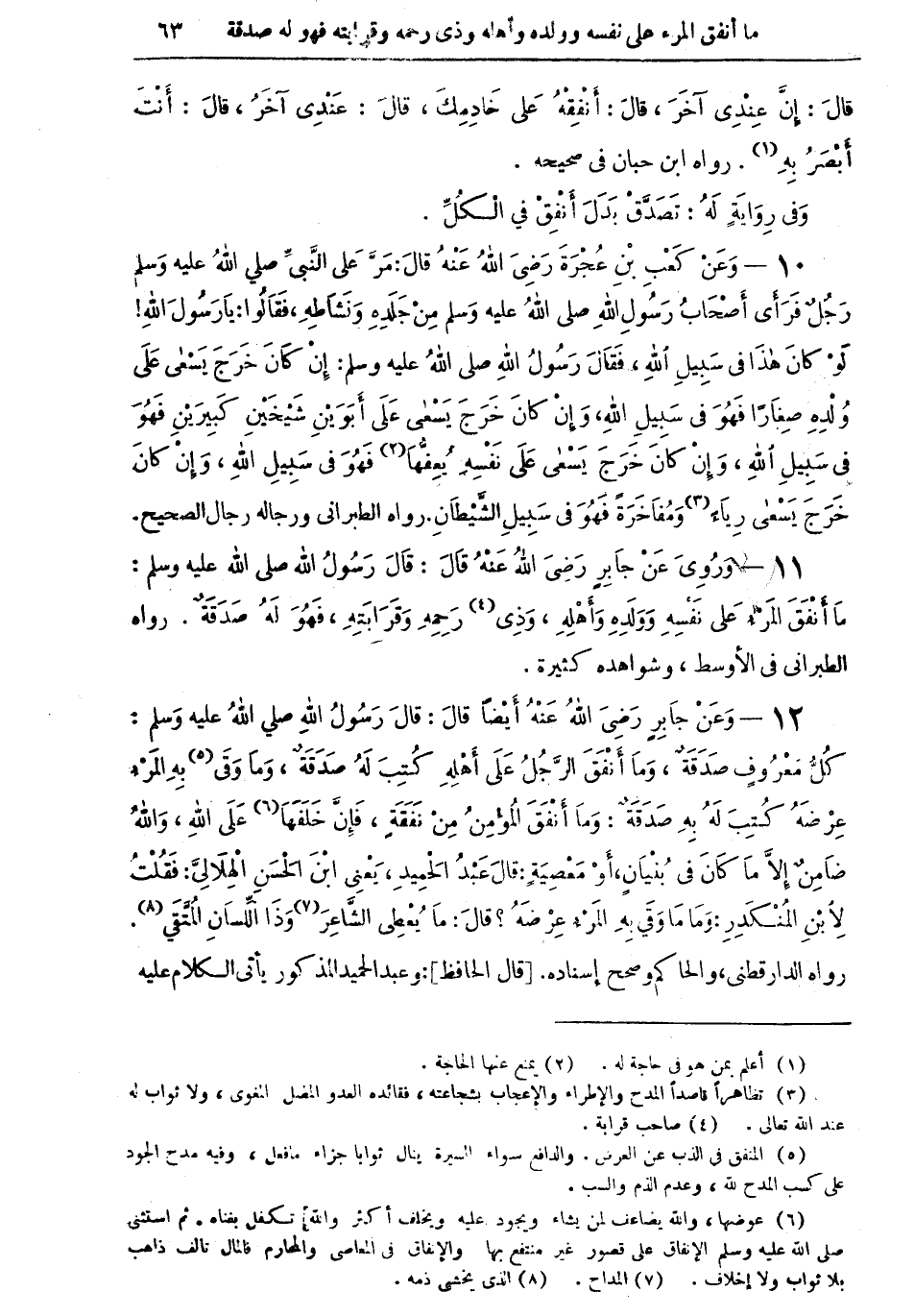 11 - ورويَ عن جابر رضي الله عنه قال: قال رسول الله صلى الله عليه وسلم: "ما أنفق المرء على نفسه وولده وأهله، وذي (¬4) رَحِمِهِ وقرابتهِ، فهو له صدقةٌ" رواه الطبراني في الأوسط، وشواهده كثيرة.