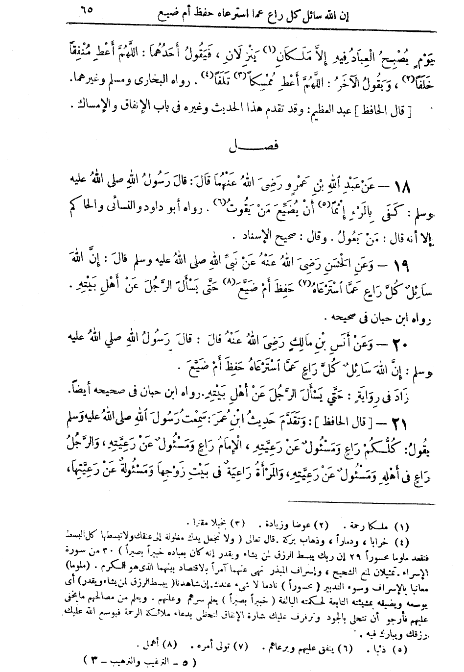 18 - عن عبد الله بن عمروٍ رضي الله عنهما قال: قال رسول الله صلى الله عليه وسلم: "كفى بالمرء إثماً (¬5) أن يضيع من يقوت (¬6) " رواه أبو داود والنسائي والحاكم إلا أنه قال: من يعول. وقال صحيح الإسناد.