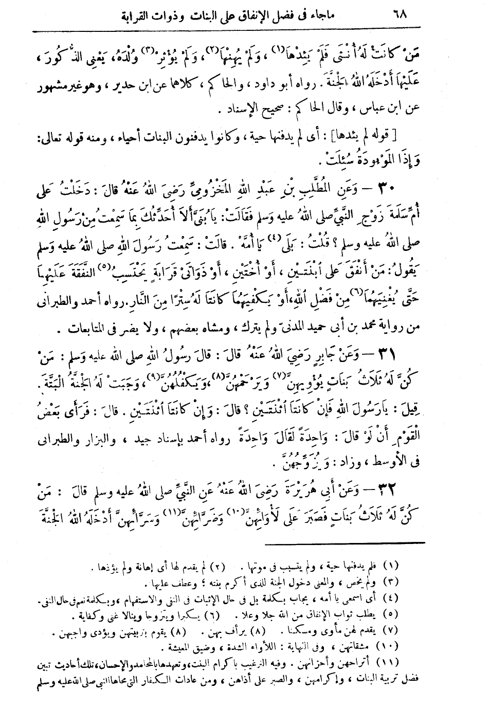 31 - وعن جابر رضي الله عنه قال: قال رسول الله صلى الله عليه وسلم: "من كُنَّ له ثلاثُ بنات يُؤويهنَّ (¬7) ويرْحَمُهُنَّ (¬8)، ويكْفُلُهُنَّ (¬9)، وجبت له الجنة البتة. قيل: يا رسول الله فإن كانتا اثنتين؟ قال: وإن كانتا اثنتين. قال: فرأى بعض القوم أن لو قال: واحدةً لقال: واحدةً" رواه أحمد بإسناد جيد، والبزار والطبراني في الأوسط، وزاد: ويُزوجهنَّ.