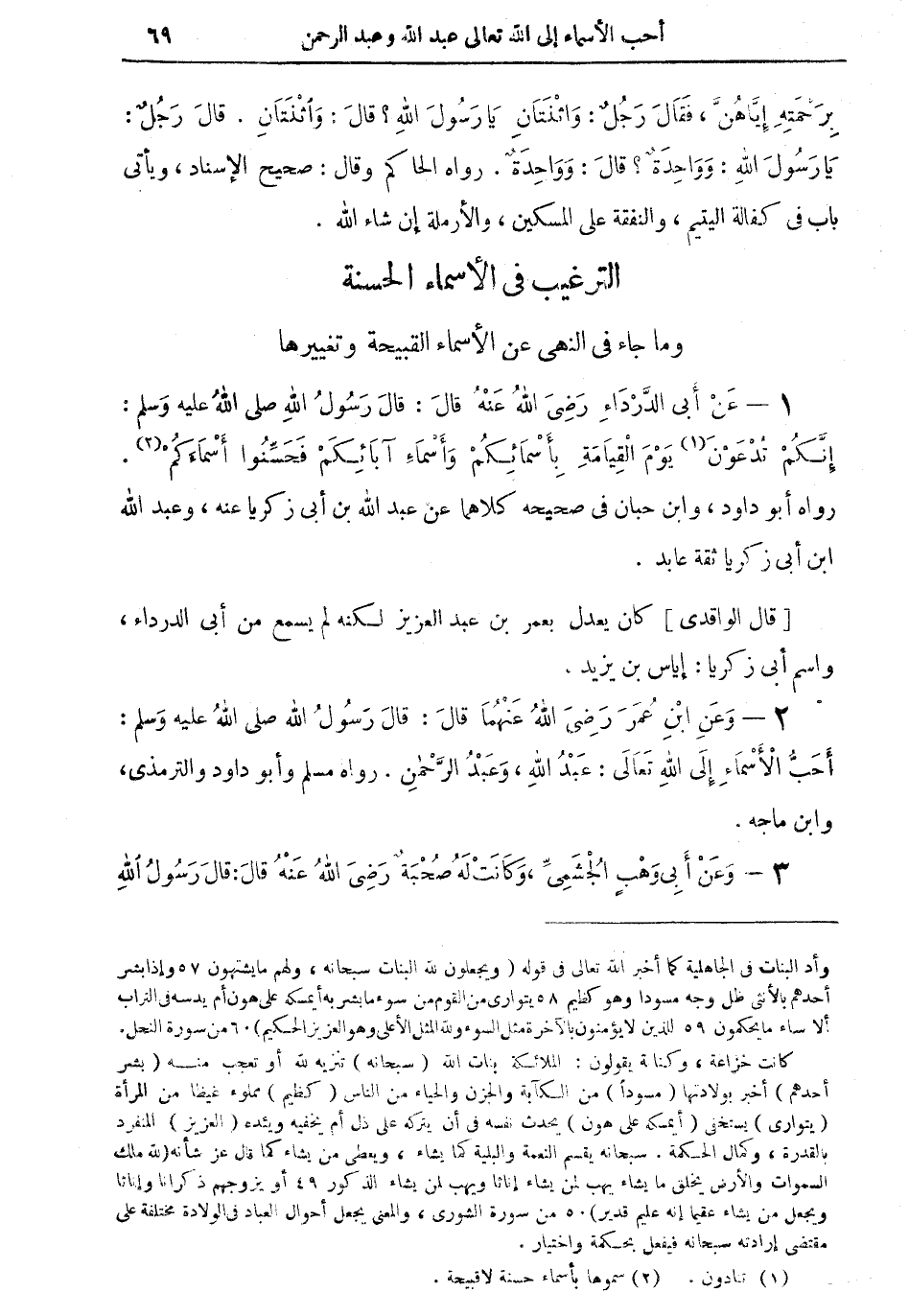 1 - عن أبي الدراء رضي الله عنه قال: قال رسول الله صلى الله عليه وسلم: "إنكم تُدْعَوْن (¬1) يوم القيامة بأسمائكم وأسماء آبائكم فَحَسِّنُوا أسماءكم (¬2) " رواه أبو داود، وابن حبان في صحيحه كلاهما عن عبد الله بن أبي زكريا عنه، وعبد الله بن أبي زكريا ثقة عابد.