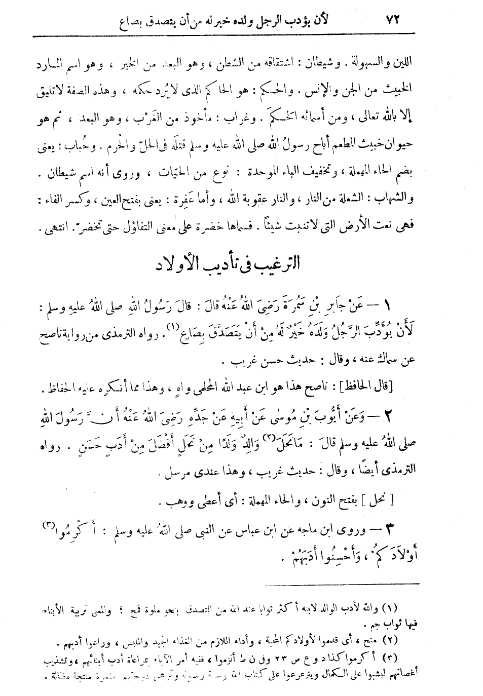 1 - عن جابر بن سَمُرَةَ رضي الله عنه قال: "قال رسول الله صلى الله عليه وسلم: لأن يؤدب الرجل ولده خير له من أن يتصدق بصاعٍ (¬1) " رواه الترمذي من رواية ناصح عن سماك عنه، وقال حديث حسن غريب.