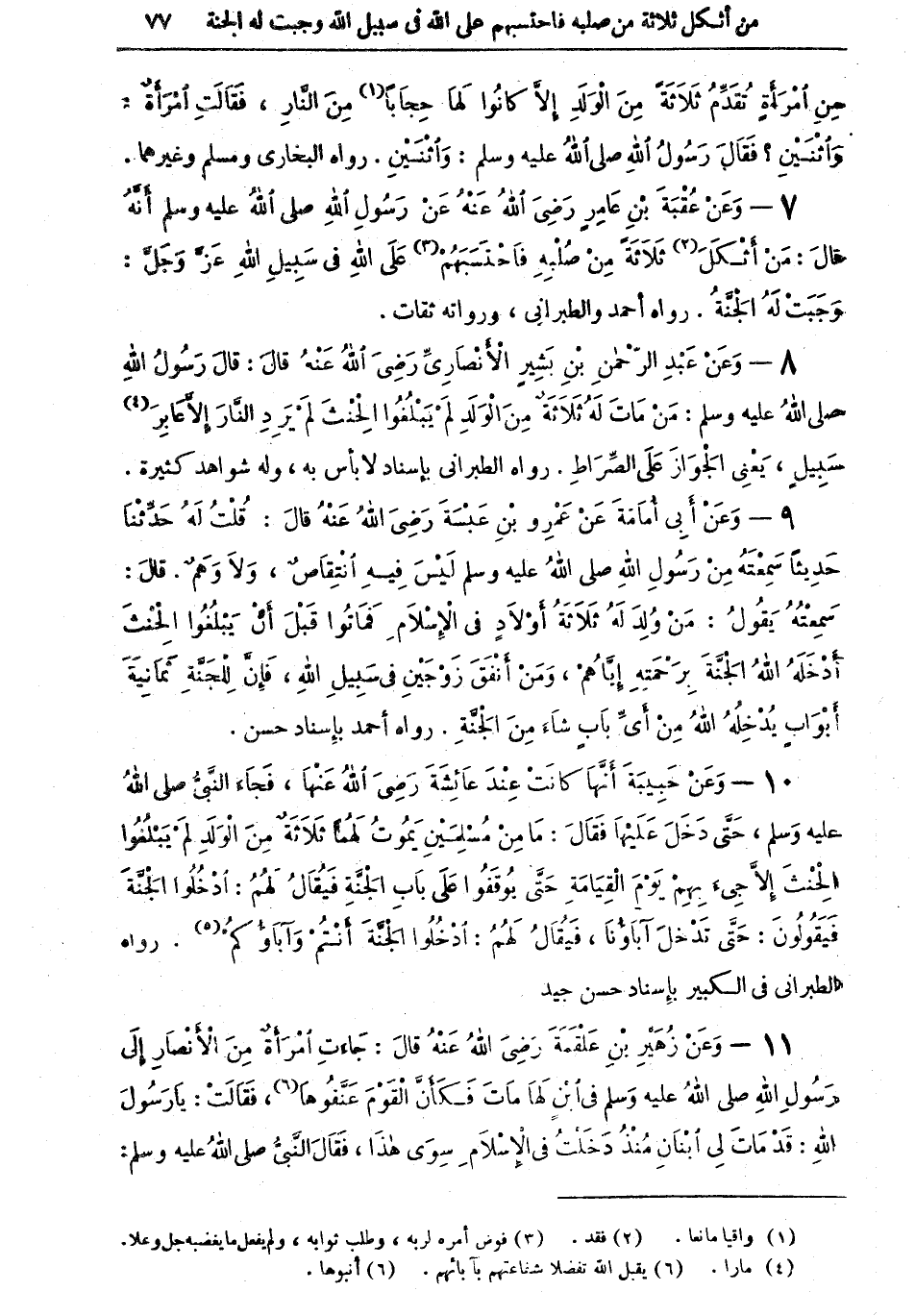 7 - وعن عقبة بن عامر رضي الله عنه عن رسول الله صلى الله عليه وسلم أنه قال: "مَنْ أثْكَلَ (¬2) ثلاثةً من صُلْبِهِ فاحتسبهم (¬3) على الله في سبيل الله عز وجل: وجبت له الجنة" رواه أحمد والطبراني ورواته ثقات.