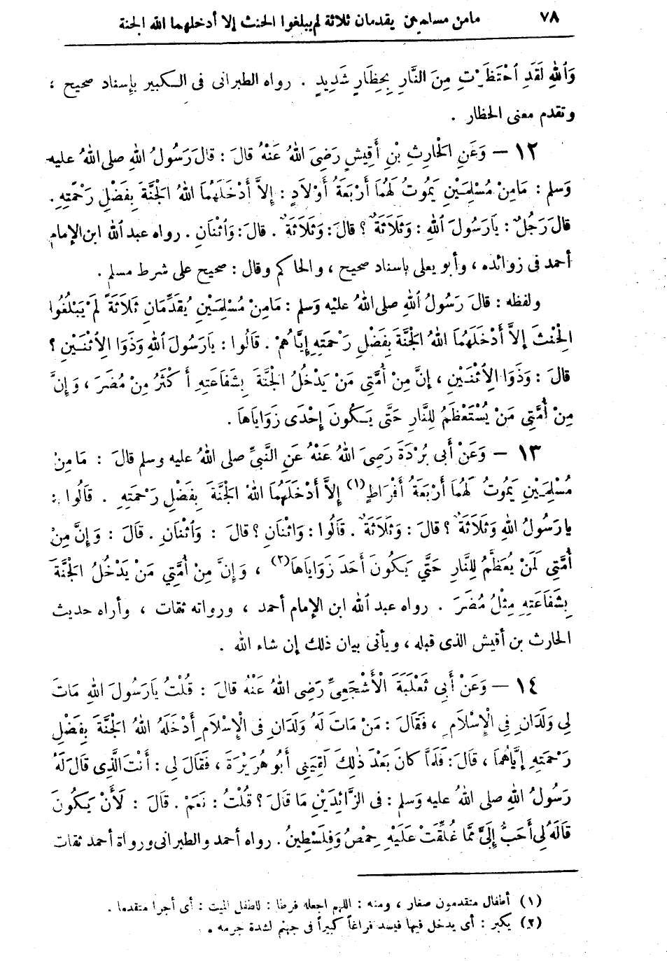 12 - وعن الحارث بن أقيش رضي الله عنه قال: قال رسول الله صلى الله عليه وسلم: "ما من مسلمين يموتُ لهما أربعةُ أولادٍ: إلا أدخلهما الله الجنة بفضل رحمته، قال رجلٌ: يا رسول الله وثلاثةٌ؟ قال: وثلاثةٌ. قال: واثنان" رواه عبد الله ابن الإمام أحمد في زوائده، وأبو يعلى بإسناد صحيح، والحاكم وقال: صحيح على شرط مسلم.