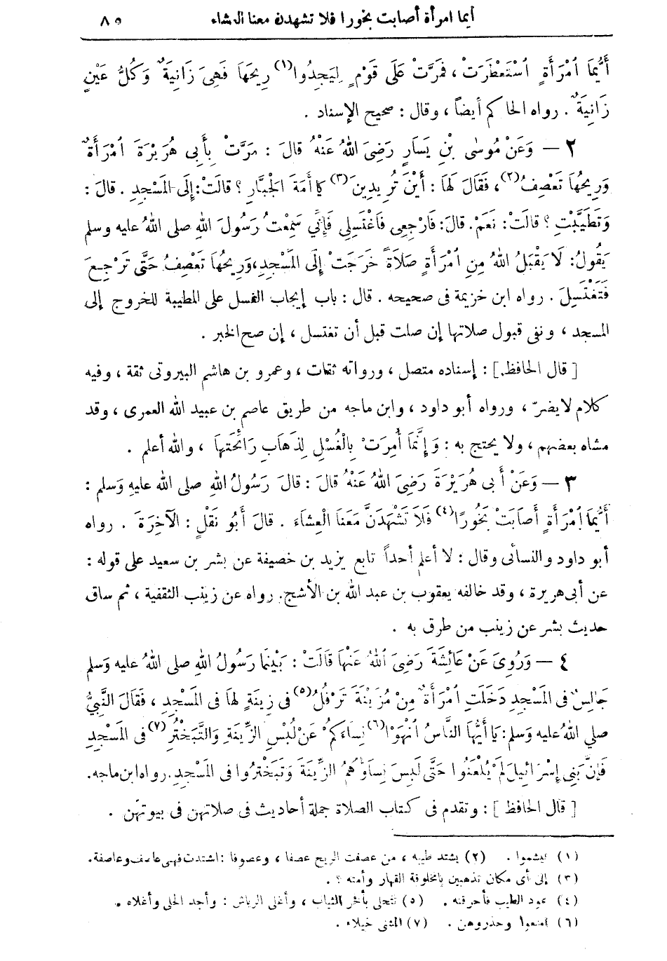 3 - وعن أبي هريرة رضي الله عنه قال: قال رسول الله صلى الله عليه وسلم: "أيما امرأةٍ أصابت بخوراً (¬4) فلا تشهدنَّ معنا العشاء. قال أبو نقلٍ: الآخرةَ" رواه أبو داود والنسائي وقال: لا أعلم أحداً تابع يزيد بن خصيفة عن بشر بن سعيد على قوله: عن أبي هريرة، وقد خالفه يعقوب بن عبد الله بن الأشج، رواه عن زينب الثقفية، ثم ساق حديث بشر عن زينب من طرق به.
