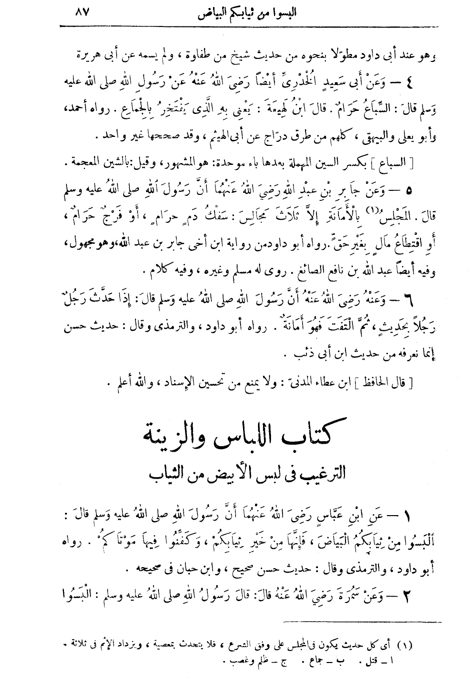 1 - عن ابن عباس رضي الله عنهما أن رسول الله صلى الله عليه وسلم قال: "البسوا مِنْ ثيابكمُ البياض، فإنها من خير ثيابكم، وَكَفِّنُوا فيها موتاكم" رواه أبو داود والترمذي وقال: حديث حسن صحيح، وابن حبان في صحيحه.