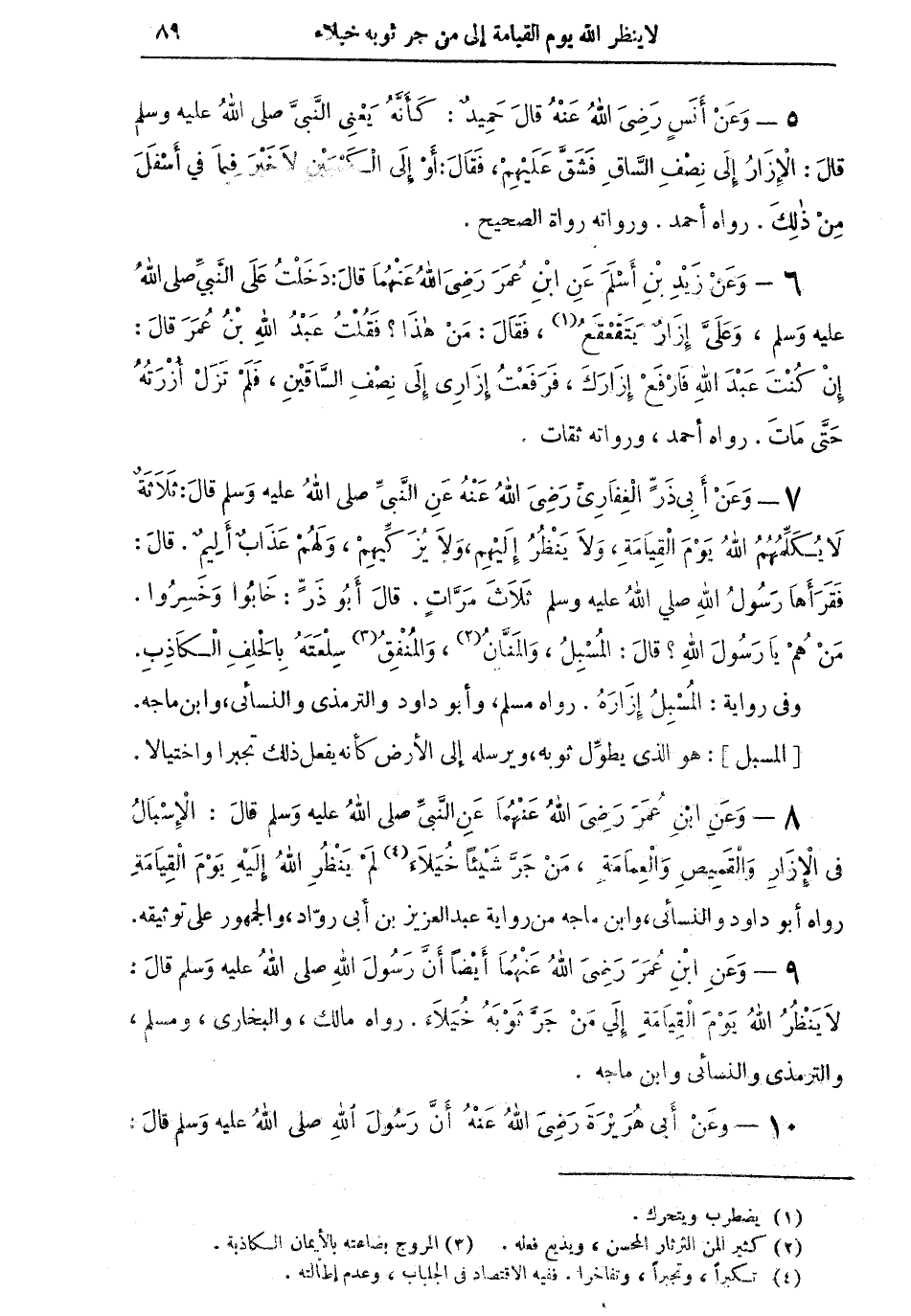5 - وعن أنس رضي الله عنه قال: "حَمِيدٌ كأنه يعني النبي صلى الله عليه وسلم قال: الإزار إلى نصف الساق فشقَّ عليهم، فقال: أو إلى الكعبين لا خيرَ فيما في أسفل من ذلك" رواه أحمد ورواته رواة الصحيح.