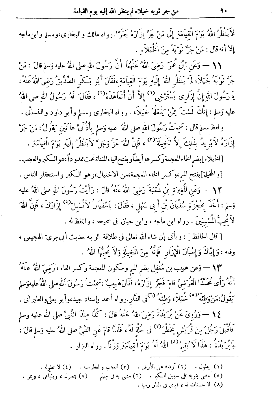 13 - وعن هبيب بن مُغْفِل بضم الميم وسكون المعجمة وكسر الفاء، رضي الله عنه "أنه رأى محمداً القرشي قام فَجَرَّ إزارهُ، فقال هبيبٌ: سمعت رسول الله صلى الله عليه وسلم يقول: مَنْ وَطِئَهُ (¬5) خُيلاء وَطِئَهُ (¬6) في النار" رواه أحمد بإسناد جيد، وأبو يعلى والطبراني.