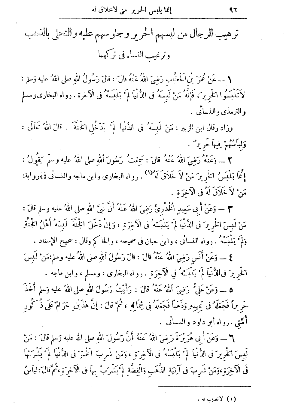 1 - عن عمر بن الخطاب رضي الله عنه قال: قال رسول الله صلى الله عليه وسلم: "لا تلبسوا الحرير، فإنه من لَبِسَهُ في الدنيا لم يلبسه في الآخرة" رواه البخاري، ومسلم، والترمذي والنسائي، وزاد وقال ابن الزبير: من لبسه في الدنيا لم يدخل الجنة. قال الله تعالى: "وَلِبَاسُهُمْ فِيهَا حَرِيرٌ".