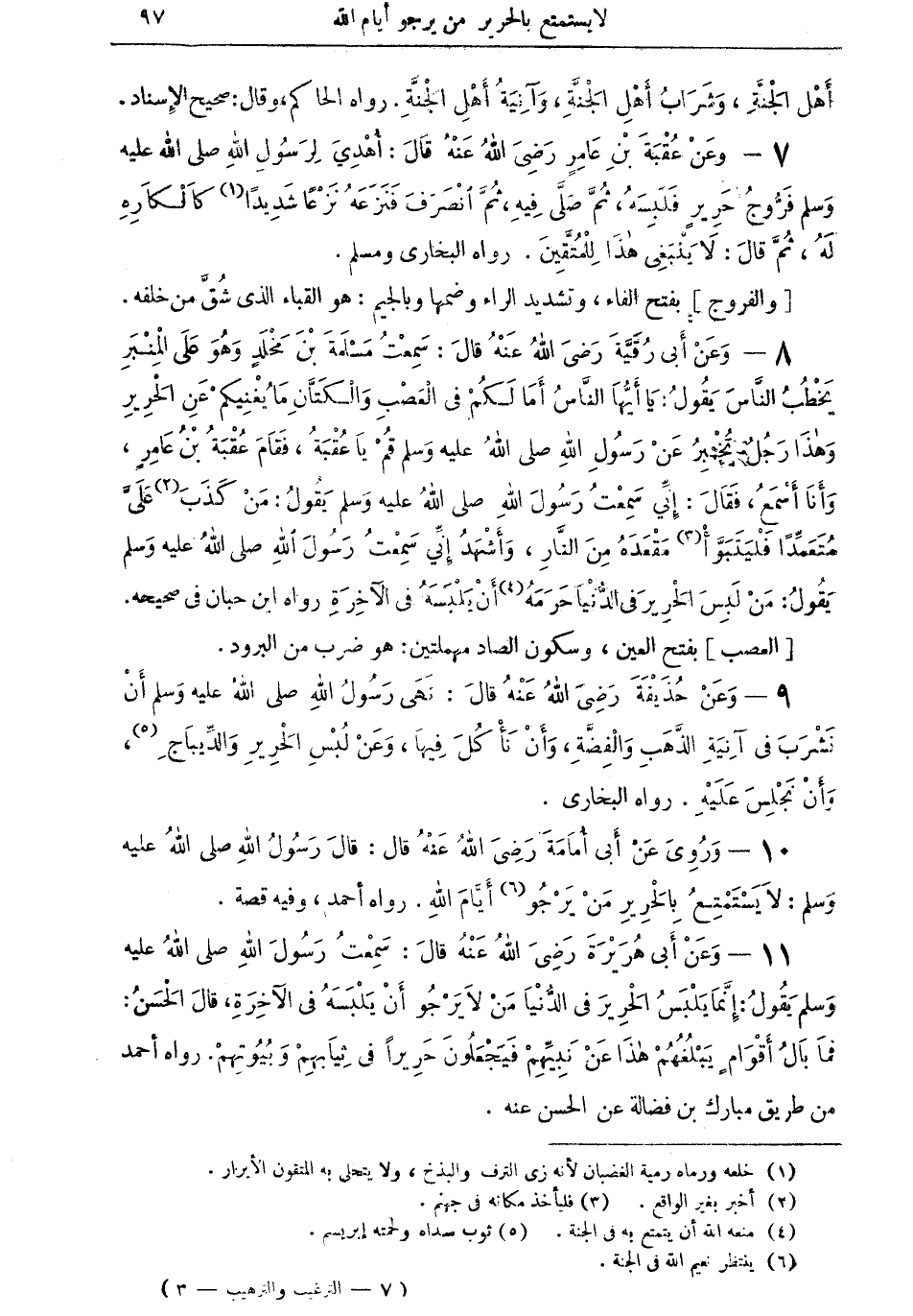 10 - ورويَ عن أبي أمامة رضي الله عنه قال: قال رسول الله صلى الله عليه وسلم: "لا يستمتعُ بالحرير من يرجو (¬6) أيَّامَ الله" رواه أحمد، وفيه قصة.