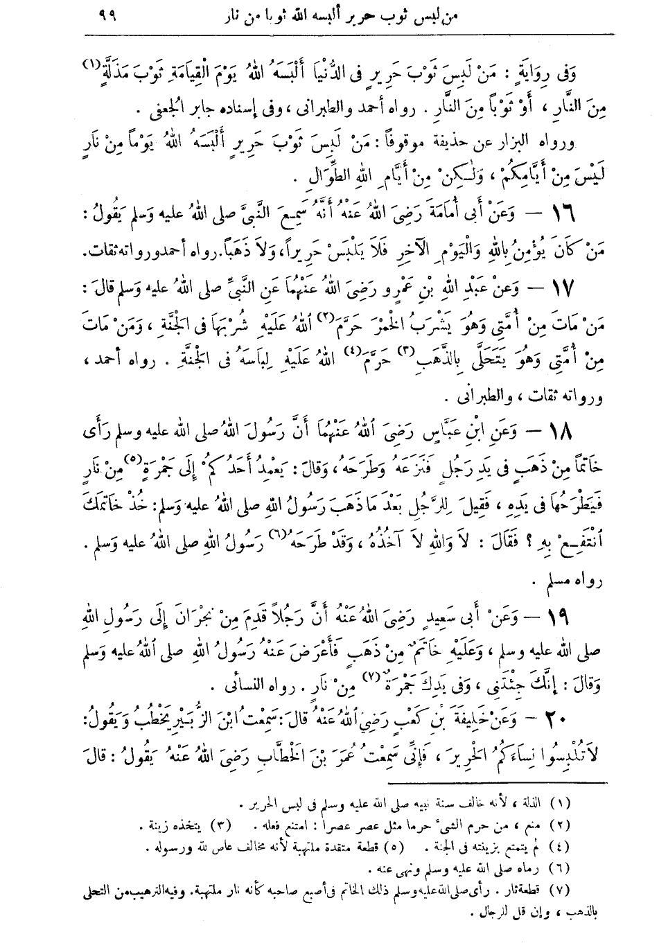 17 - وعن عبد الله بن عمروٍ رضي الله عنهما عن النبي صلى الله عليه وسلم قال: "من مات من أمتي وهو يشربُ الخمرَ حَرَّمَ (¬2) الله عليه شُربها في الجنة، ومن مات من أمتي وهو يتحلى بالذهب (¬3) حَرَّمَ (¬4) الله عليه لِبَاسَهُ في الجنة" رواه أحمد، ورواته ثقات، والطبراني.