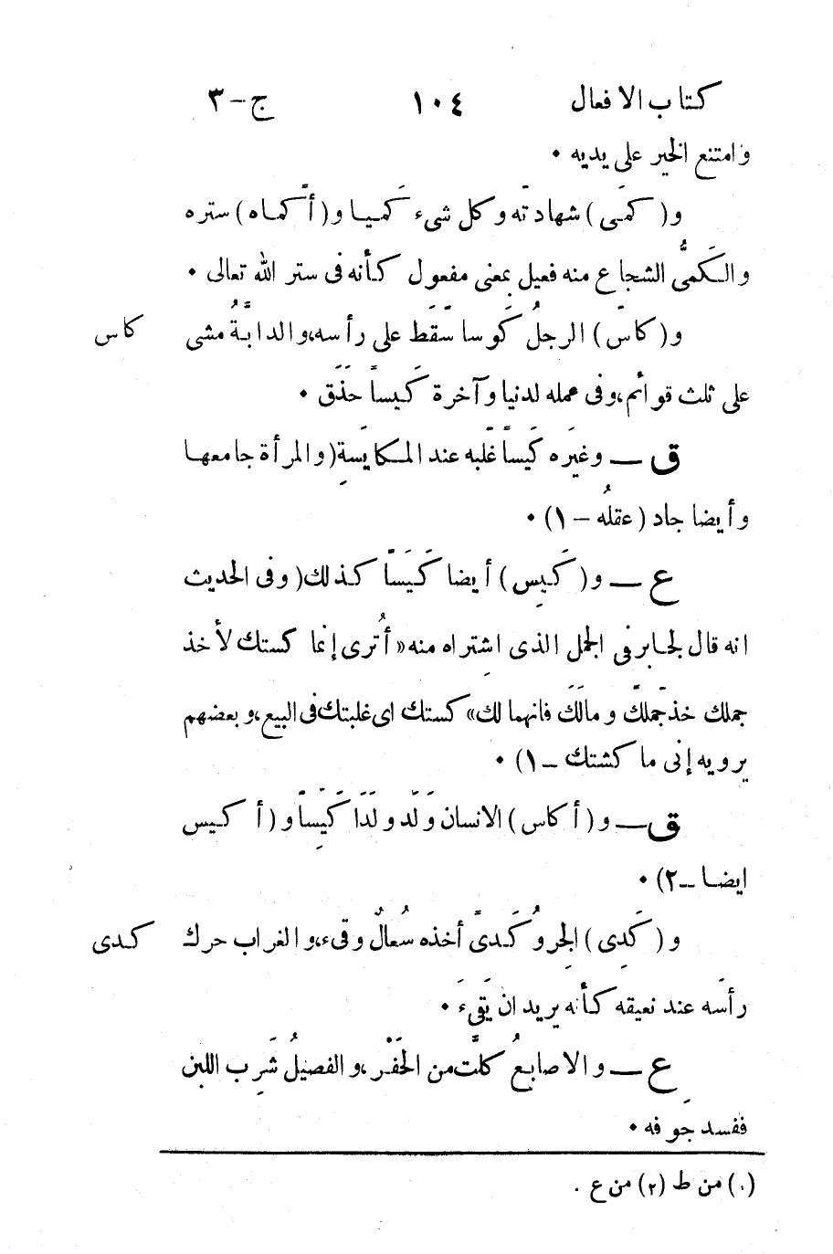 ع - و "كَيِس" أيضاً كَيسَاً كذلك "وفي الحديث: أنه قال لجابر في الجمل الذي اشتراه منه "أتُرى إنما كستك لأخذ جملك خذ جَملك ومالَكَ فإنهما لكَ" كستك أي غلبتك في البيع وبعضهم يرويه إني ما كشتك -1".