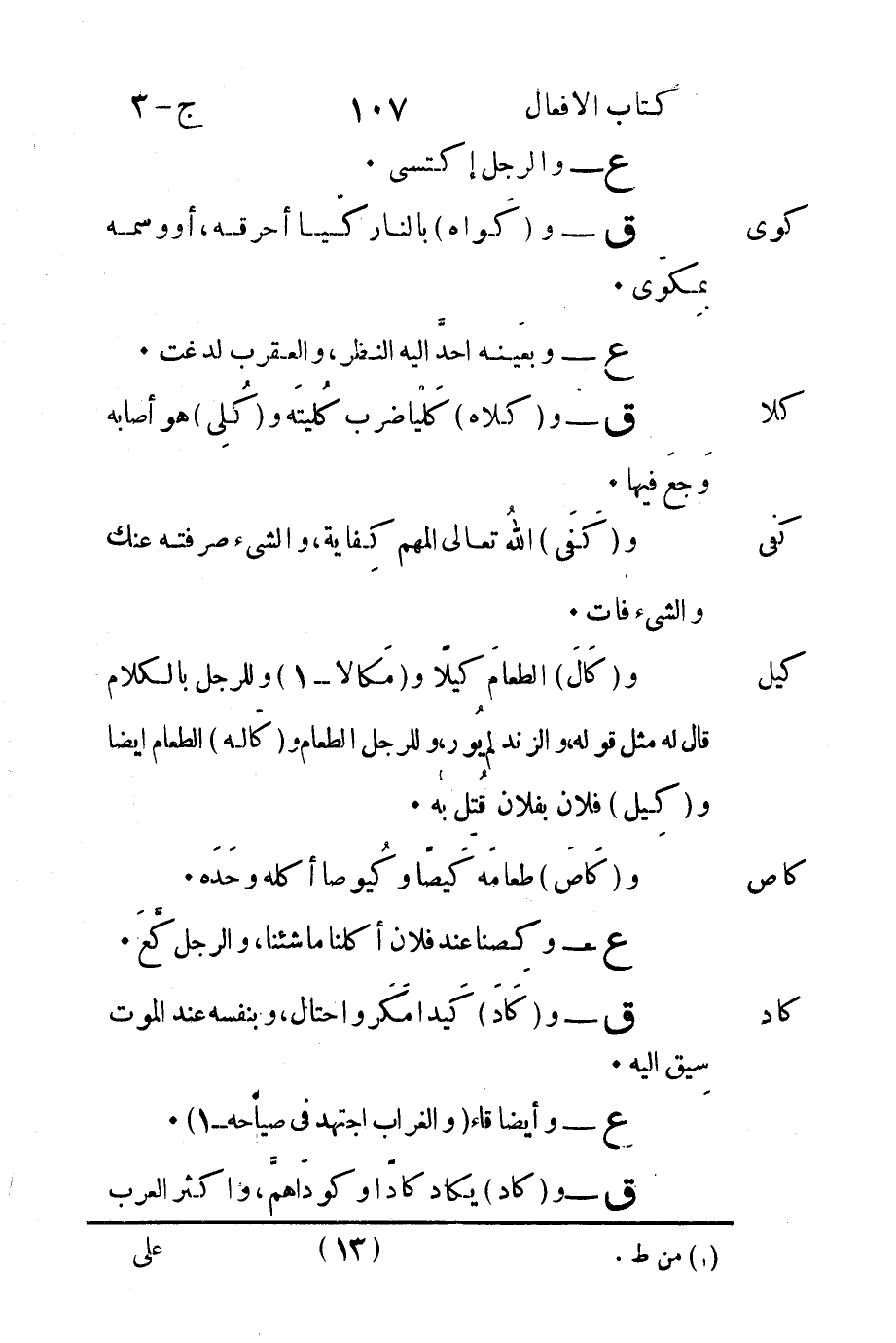 كيل: و "كَالَ" الطعامَ كبلاَ و "مَكالاً -1" وللرجل بالكلام قال له مثل قوله والزند لم يُور وللرجل الطعام و "كَاله" الطعام أيضاً و "كِيل" فلان بفلان قُتِل به.