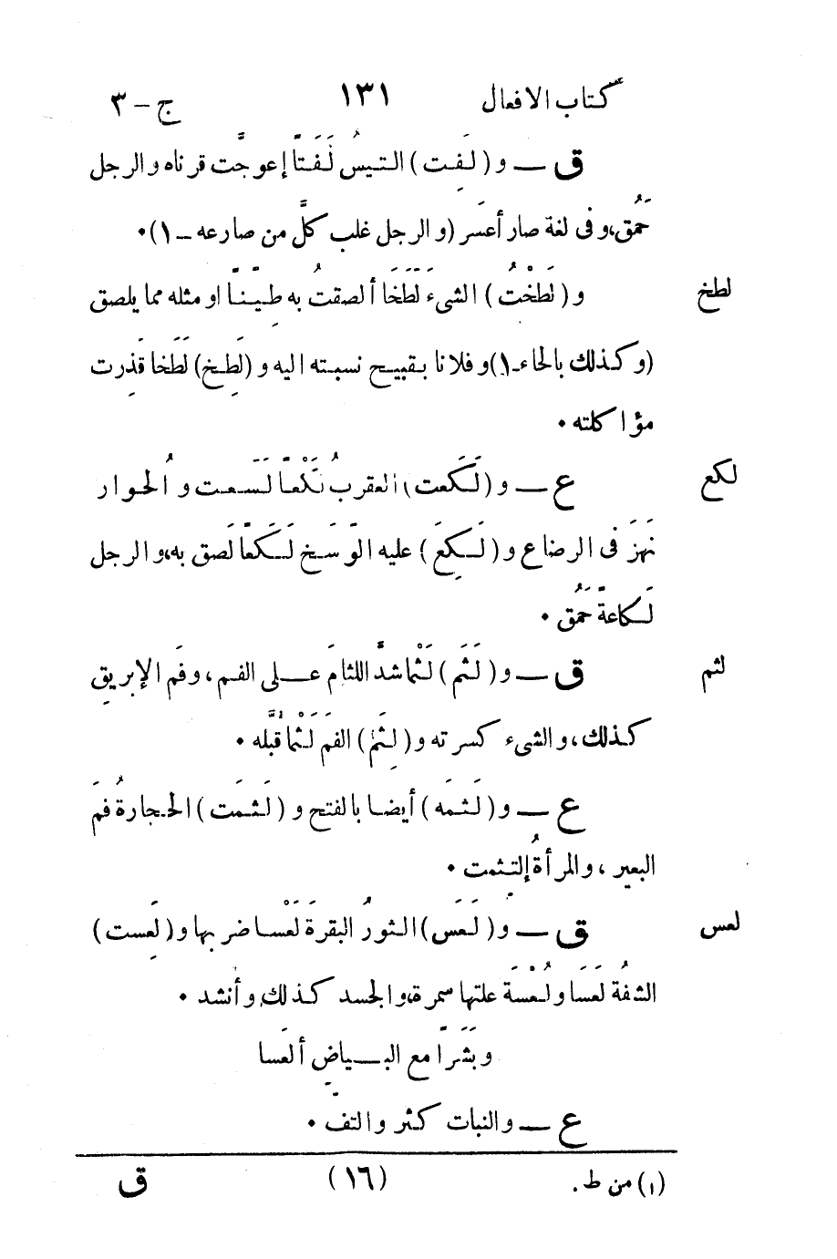 ق - و "لَفِت" التيسُ لَفَتاً إعوجَّت قرناه والرجل حَمُق وفي لغة صار أعَسر "والرجل غلب كلَّ من صارعه -1".