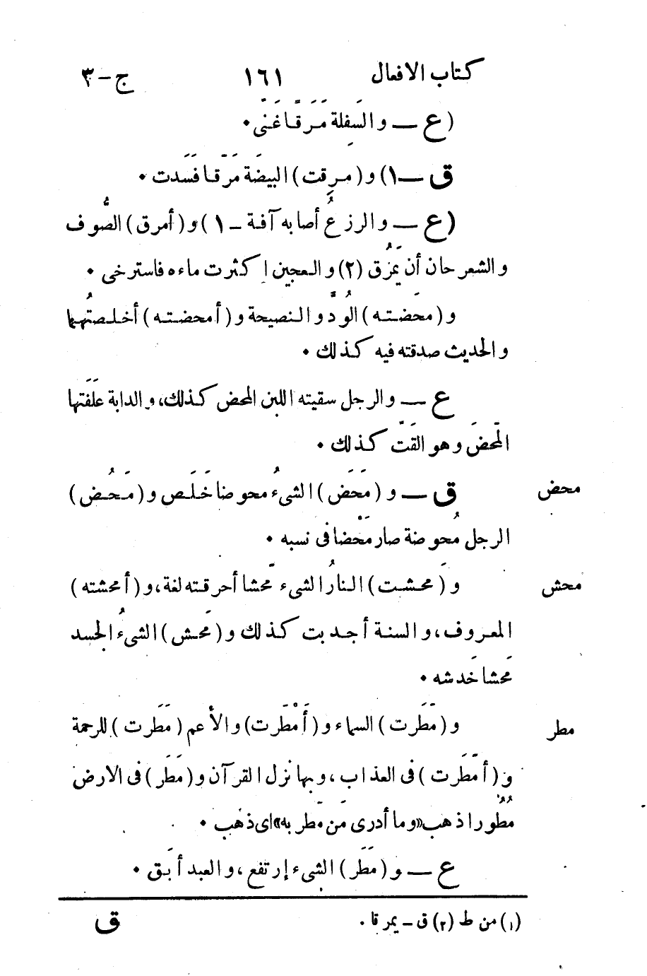 مطر: و "مَطَرت" السماء و "أمْطَرت" والأعم "مَطَرت" للرحمة و "أمَطَرت" في العذابِ وبها نزل القرآن و "مَطَر" في الأرض مُطُوراً ذهب "وما أدرى من مطر به" أي ذهب.