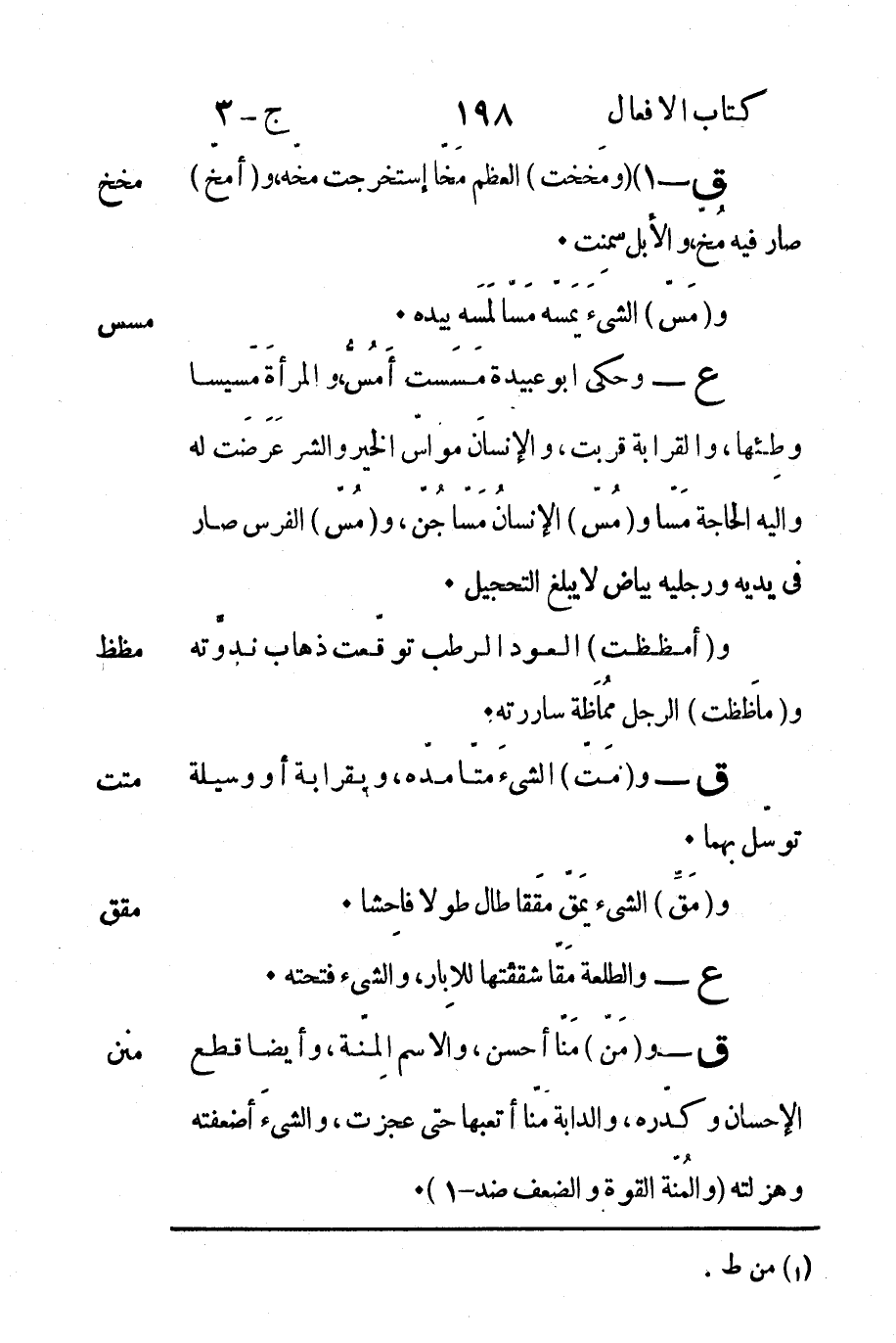 ع - وحكى أبو عبيدة مَسَست أمُسُّ والمرأةً مَسيساً وطِئها والقرابة قربت والإنسان مواسّ الخير والشر عَرَضت له وإليه الحاجة مَسّاً و "مُسّ" الإنسان مَسّاً جُنّ و "مُسّ" الفرس صار في يديه ورجليه بياض لا يبلغ التحجيل.