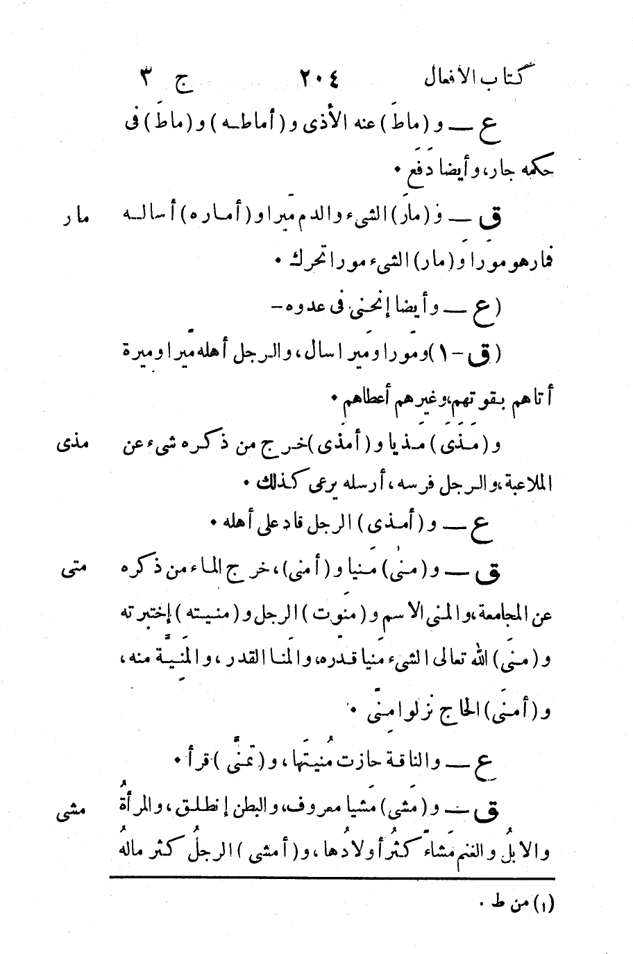 مشى: ق - و "مَشى" مَشياً معروف والبطن إنطلق والمرأةُ والإبلُ والغنم مَشاءً كثُر أولادها و "أمشى" الرجلُ كثر مالُه.