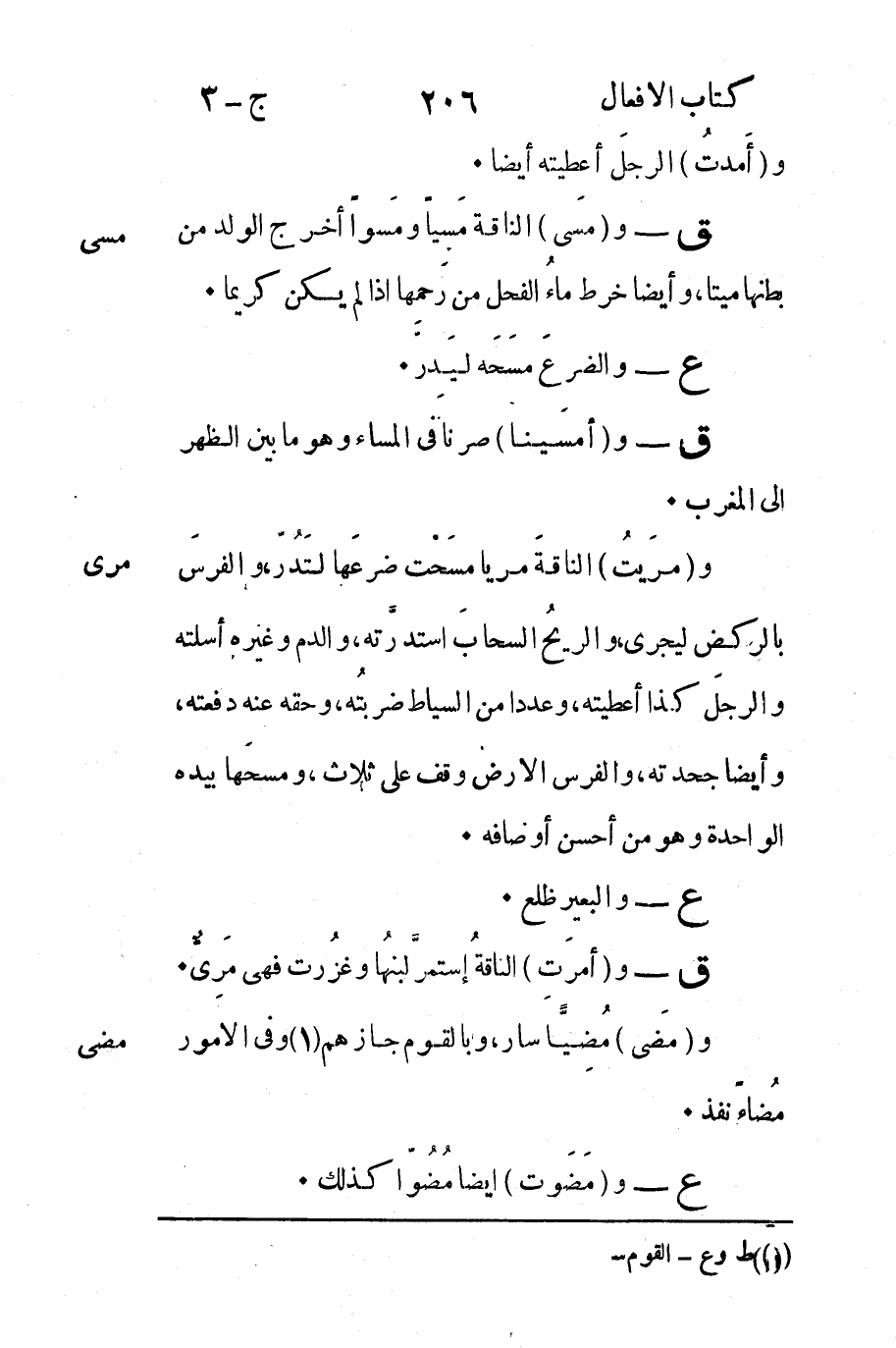 مرى: و "مرَيت" الناقةَ مرياً مسَحْت ضرعَها لتَدُرّ والفرسَ بالركض ليجري والريحُ السحابَ استدرَّته والدم وغيره أسلته والرجلَ كذا أعطيته وعدداً من السياط ضربتُه وحقه عنه دفعته وأيضاً جحدته والفرس الأرض وقف على ثلاث ومسحَها بيده الواحدة وهو من أحسن أوصافه.