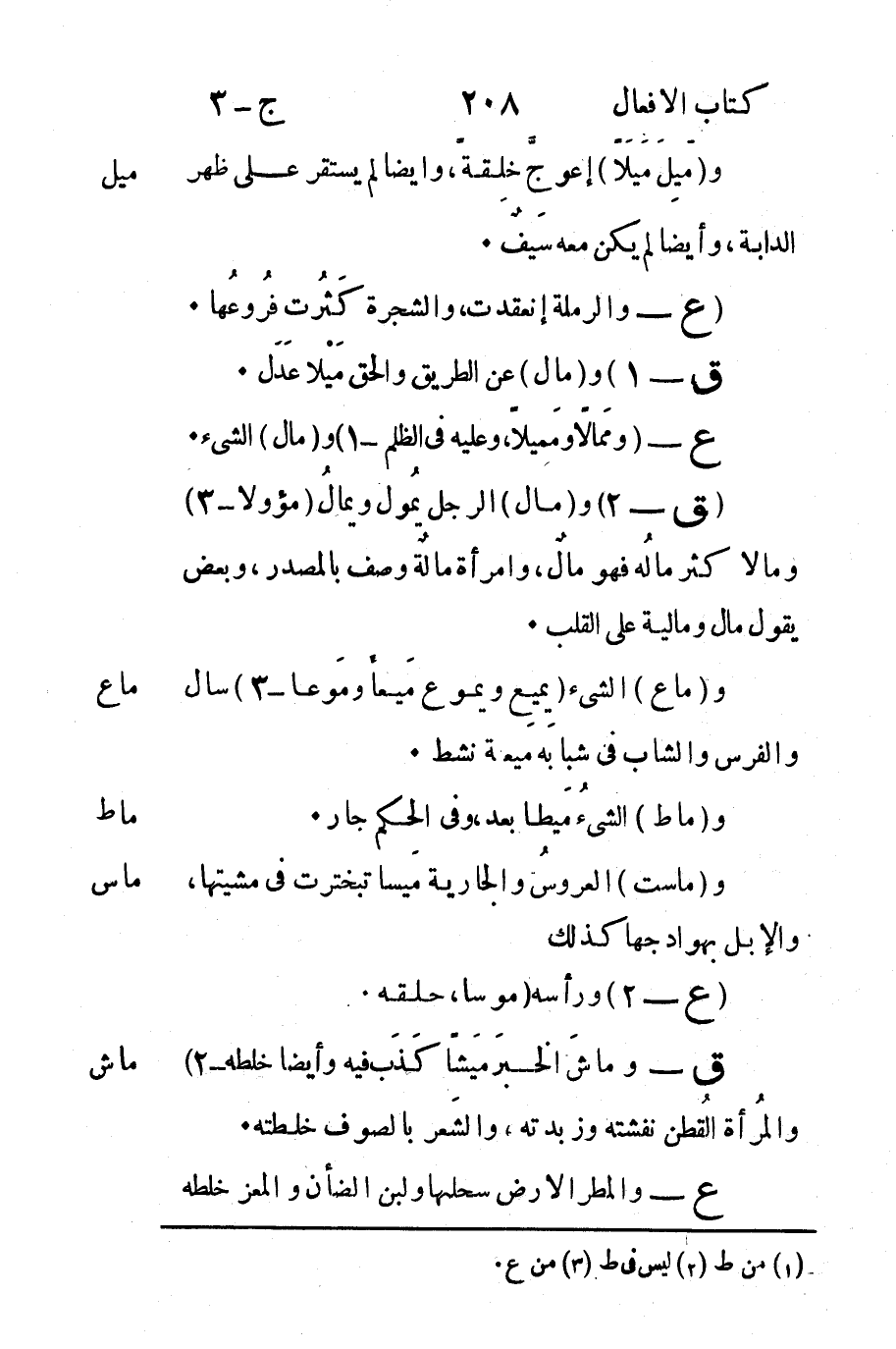 ميل: و "مَيِلَ مَيَلاً" إعوجَّ خِلقةً وأيضاً لم يستقر على ظهر الدابة وأيضاً لم يكن معه سَيفٌ.