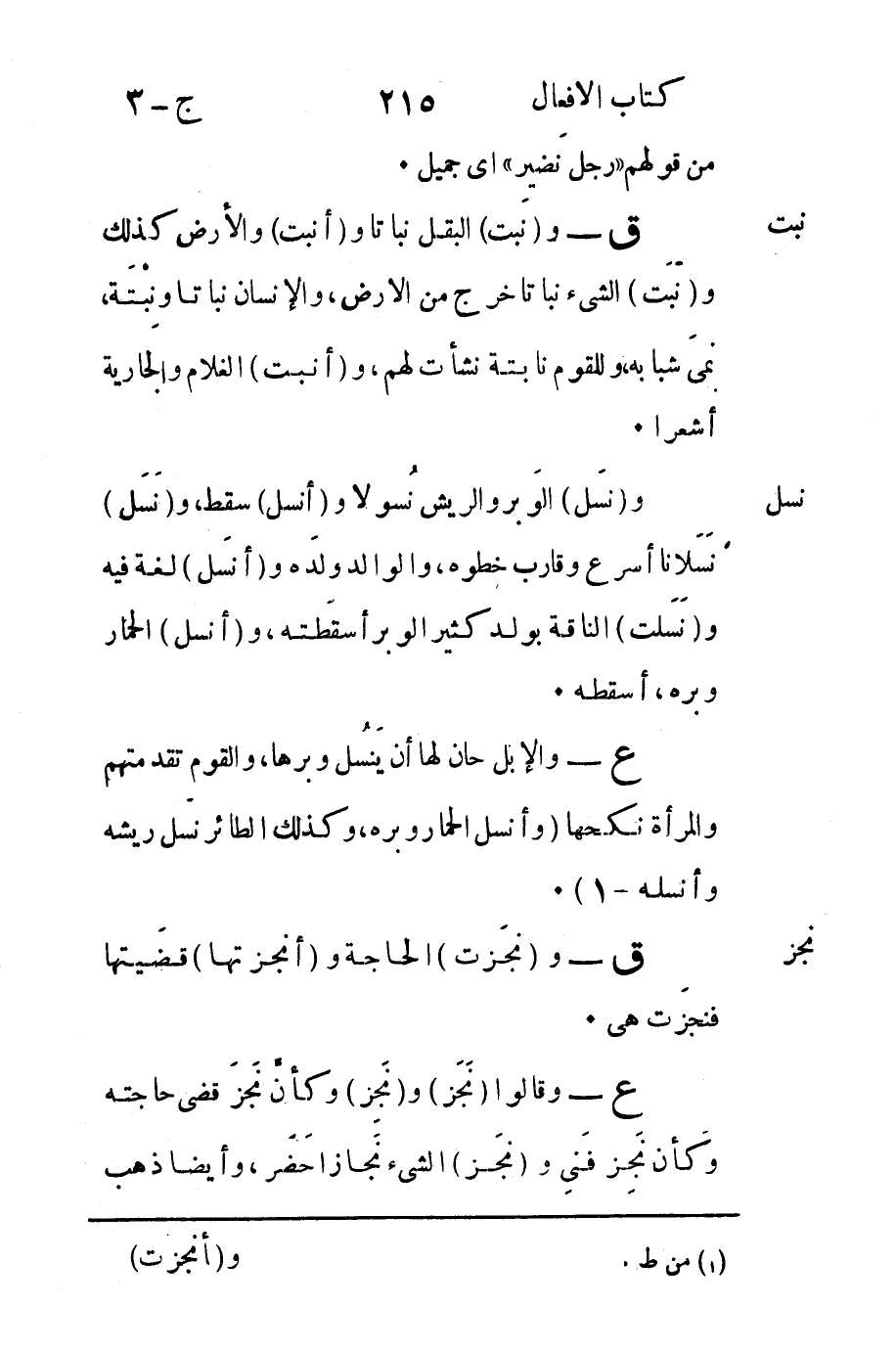 ع - وقالوا "نَجَز" و "نَجِز" وكأن نَجزَ قضى حاجته وكأن نَجِز فَنِي و "نجَز" الشيء نَجازاً حَضَر وأيضاً ذهب