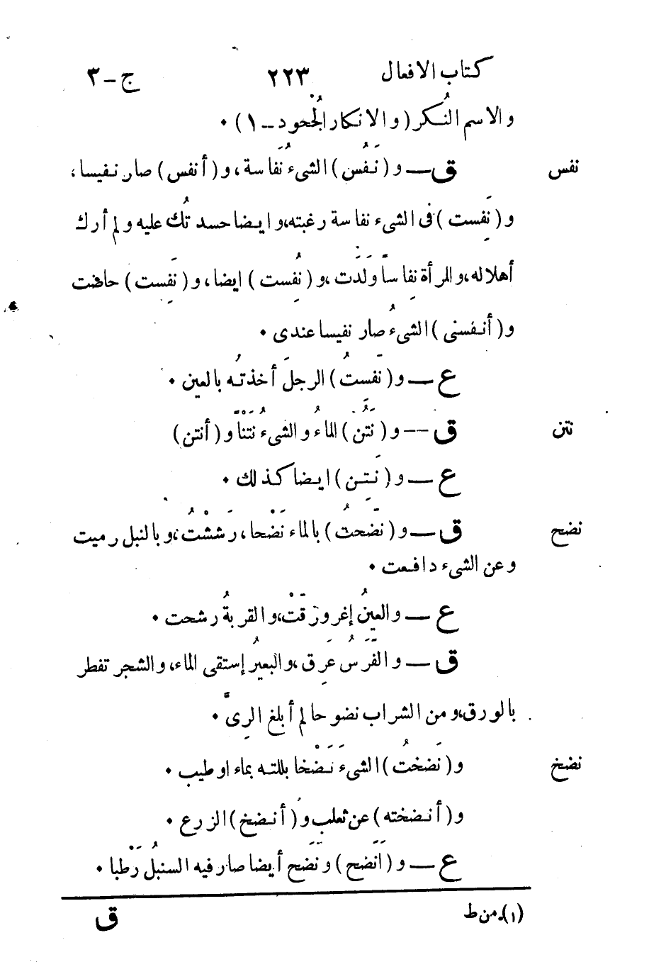 نفس: ق - و "نَفُس" الشيء نُفَاسة و "أنفس" صار نفيساً و "نَفِست" في الشيء نفاسة رغبته وأيضاً حسدتُك عليه ولم أرك أهلاله والمرأة نِفاساً وَلَدَت و "نُفِست" أيضاً و "نَفِست" حاضت و "أنفسنى" الشيءُ صار نفيساً عندي.