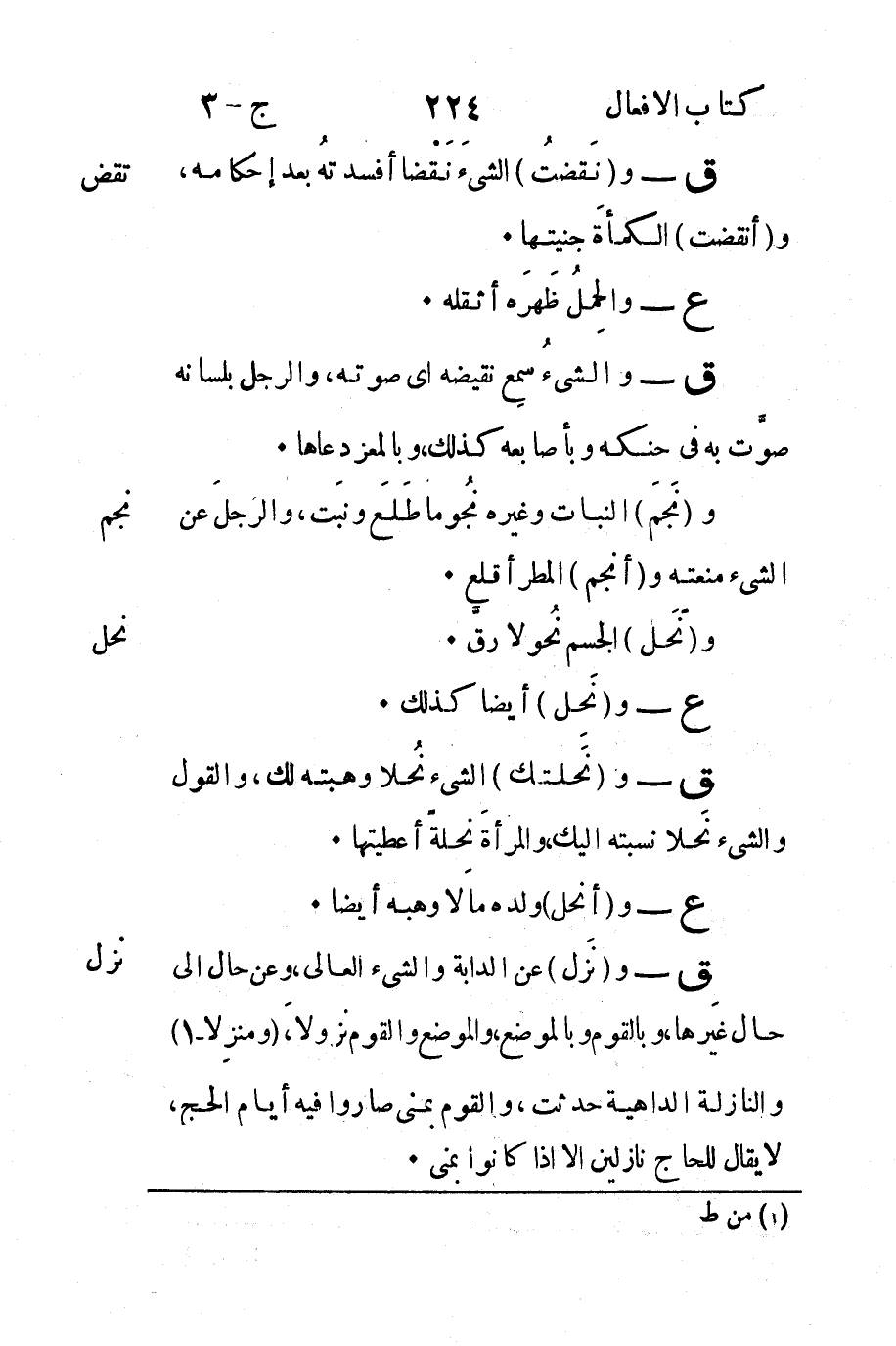 نزل: ق - و "نَزل" عن الدابة والشيء العالي وعن حال إلى حال غَيرها وبالقوم وبالموضع والموضع والقوم نُزولاً "ومنزلاً -1" والنازلة الداهية حدثت والقوم بمنى صاروا فيه أيام الحج لا يقال للحاج نازلين إلا إَذا كانوا بمنى.