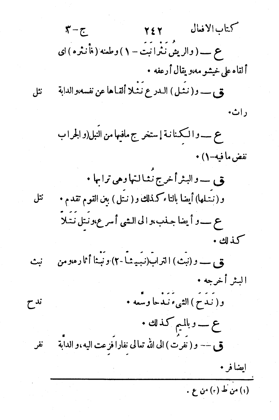 ع - "والريشُ نَثْراً نَبَت -1" وطعنه "فأنثره" أي ألقاه على خيشومه ويقال أرعفه.