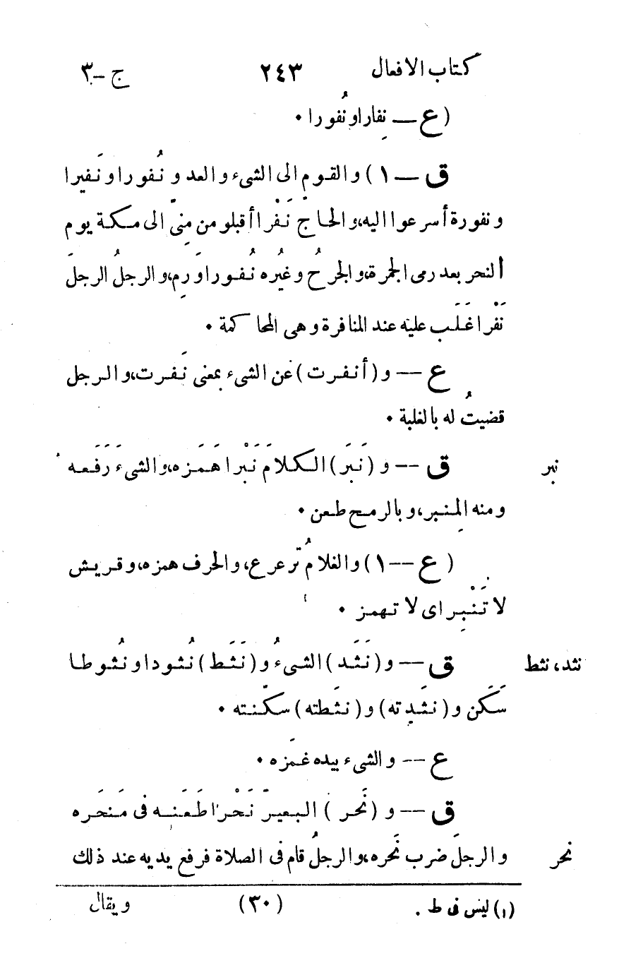 ق –1" والقوم إلى الشيء والعد ونُفوراً ونَفيراً ونفورة أسرعوا إليه والحاجّ نَفْراً أقبلوا من منىّ إلى مكة يوم النحر بعد رمي الجمرة والجرحُ وغيرُه نُفوراً وَرِم والرجلُ الرجلَ نَفْراً غَلَب عليه عند المنافرة وهي المحاكمة.