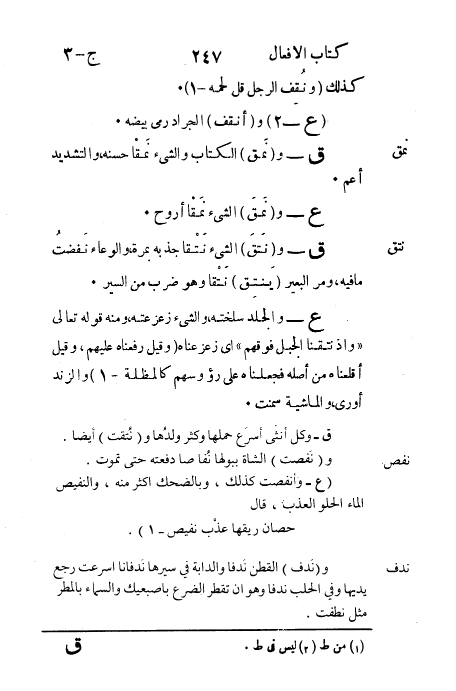 نتق: ق - و "نَتَق" الشيء نَتْفاً جذبه بمرة والوعاء نَفضتُ ما فيه ومر البعير "يَنتِق" نَتْقاً وهو ضرب من السير.