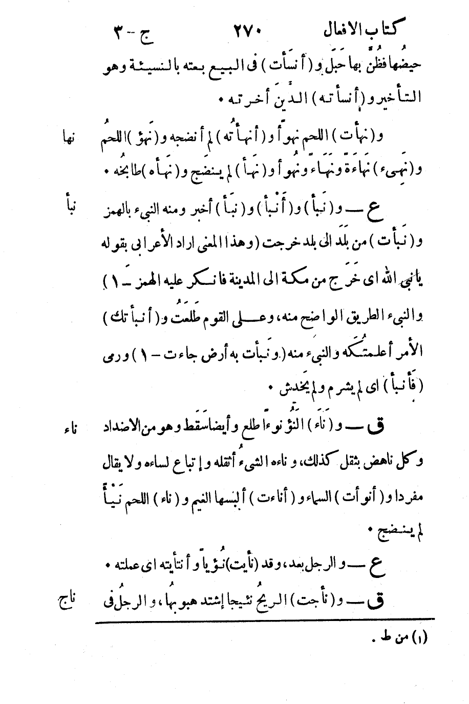 نبأ: ع - و "نَبأ" و "أنْبأ" و "نَبَأ" أخبر ومنه النبئ بالهمز و "نَبأت" من بَلَد إلى بلد خرجت "وهذا المعنى أراد الأعرابي بقوله يا نبي الله أي خَرَج من مكة إلى المدينة فأنكر عليه الهمز -1" والنبئ الطريق الواضح منه وعلى القوم طَلَعُت و "أنبأتك" الأمر أعلمتُكَه والنبئ منه "ونَبأت به أرض جاءت -1" ورمى "فَأنبأ" أي لم يشرم ولم يَخدش.