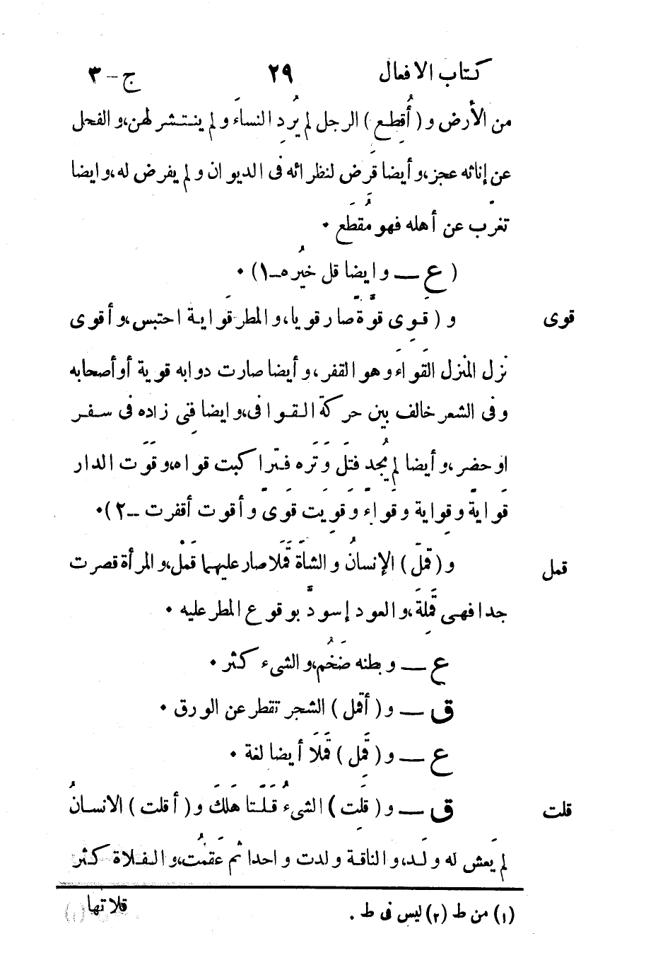 قوى: و "قَوِي قوَّةً صار قويا والمطر قَواية احتبس وأقوى نزل المنزل القَواءَ وهو القفر وأيضاً صارت دوابه قوية أو صحابه وفي الشعر خالف بين حركة القوافي وأيضاً فنى زاده في سفر أو حضر وأيضاً لم يجُد فتلَ وَتَره فتراً كبت قواه وقَوَت الدار قَوايةً وِقواية وقواء وقَوِيت قَوىً وأقوت أقفرت -2".