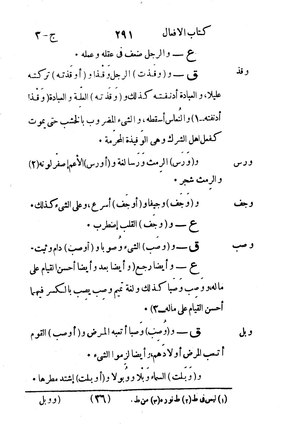 ع - وأيضاً رجع وأيضاً بعد وأيضاً أحسن القيام على ماله" وَصِب وَصَباً كذلك ولغة تميم وصِب يصِب بالكسر فيهما أحسن القيام على ماله -3".