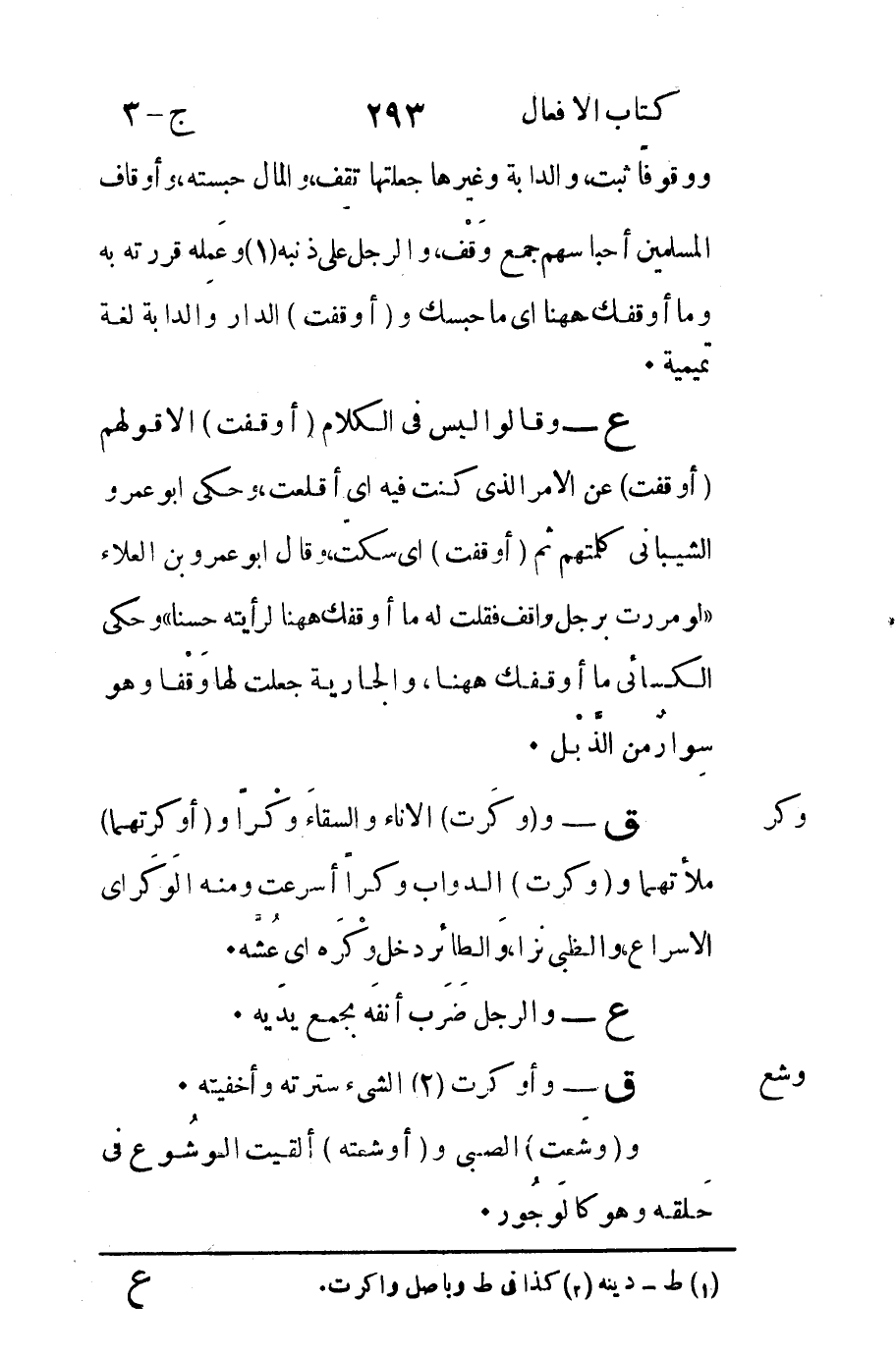 ووقوفاً قبت والدابة وغيرها جعلتها تقف والمال حبسته وأوقاف المسلمين أحبا سهم جمع وَقْف والرجل على ذنبه1 وعَمِله قررته به وما أوقفك ههنا أي ما حبسك و "أوقفت" الدار والدابة لغة تميمية.