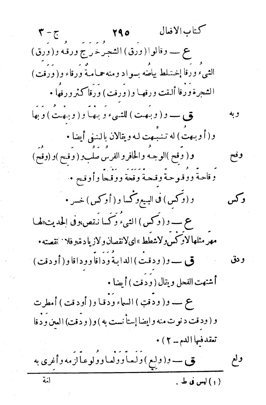 وقالوا "ورَق" الشجرُ خَرَجَ ورقه و "وَرِق" الشيءُ ورَقاً اختلط بياضُه بسواد ومنه حمامة وَرقاء و "وَرَقت" الشجرة وَرْقاً ألقت ورقها و "وَرِقت" وَرقاً كثر ورقُها.