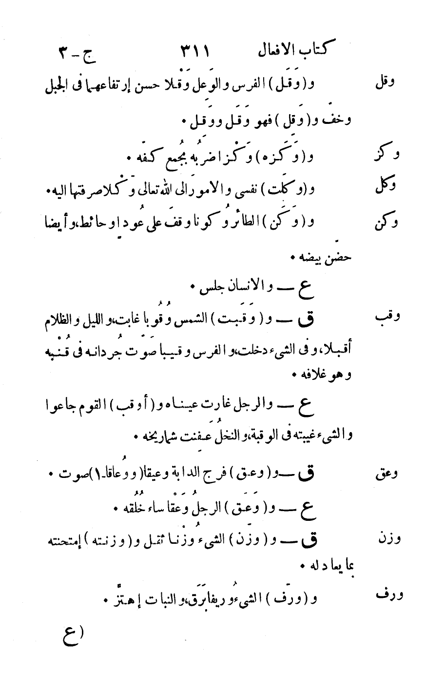 وقل: و "وَقَل" الفرس والوَعل وَقْلا حسن إرتفاعهما في الجبل وخفّ و "وَقِل" فهو وقل ووَقِل.